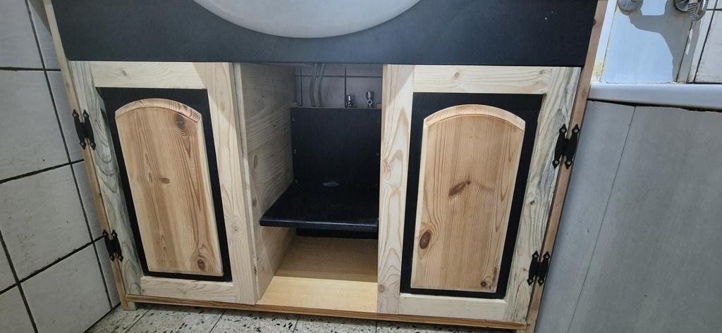 J'en ai profité pour créer un meuble plus esthétique : tout l'espace des tuyaux et de l'évacuation est maintenant caché derrière un panneaux en bois amovible, ce qui rend l'ensemble beaucoup plus propre et chaleureux.