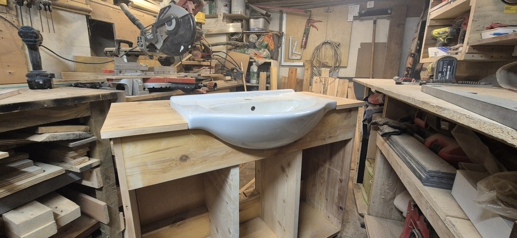 Mon idée était de ne pas devoir racheter de lavabo : j'ai donc construit ce nouveau artisanal autour de celui que j'avais déjà, en l'adaptant parfaitement à sa forme.