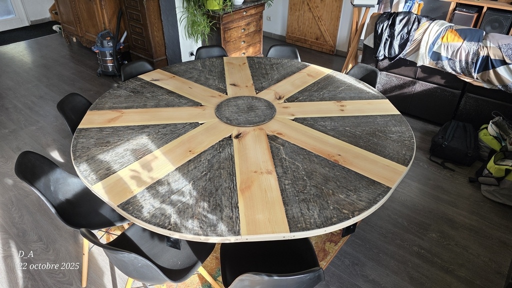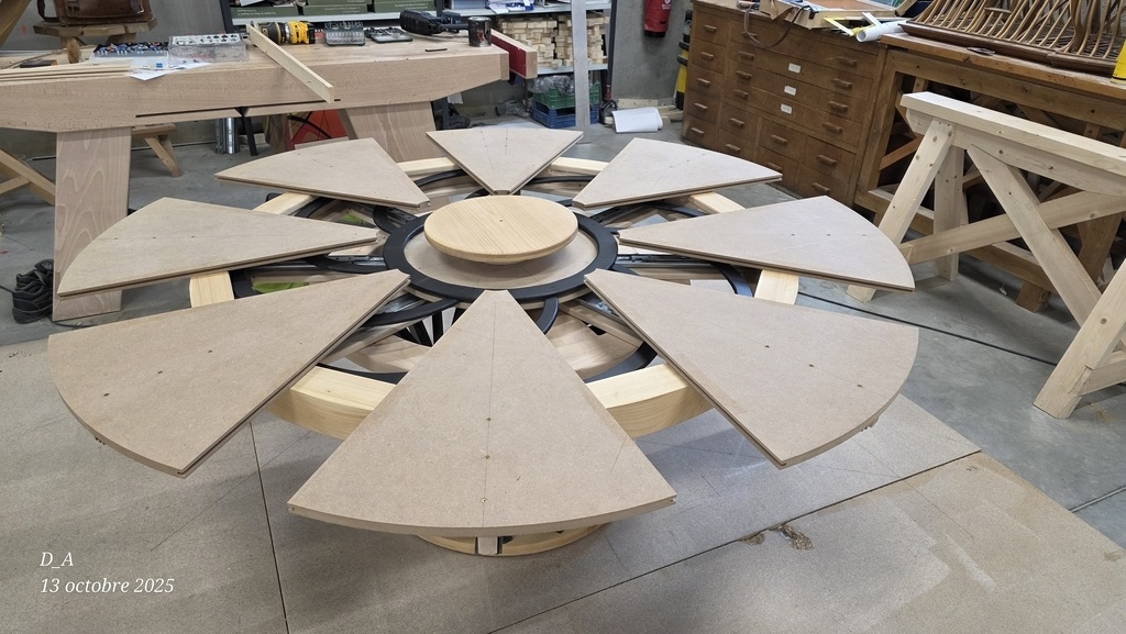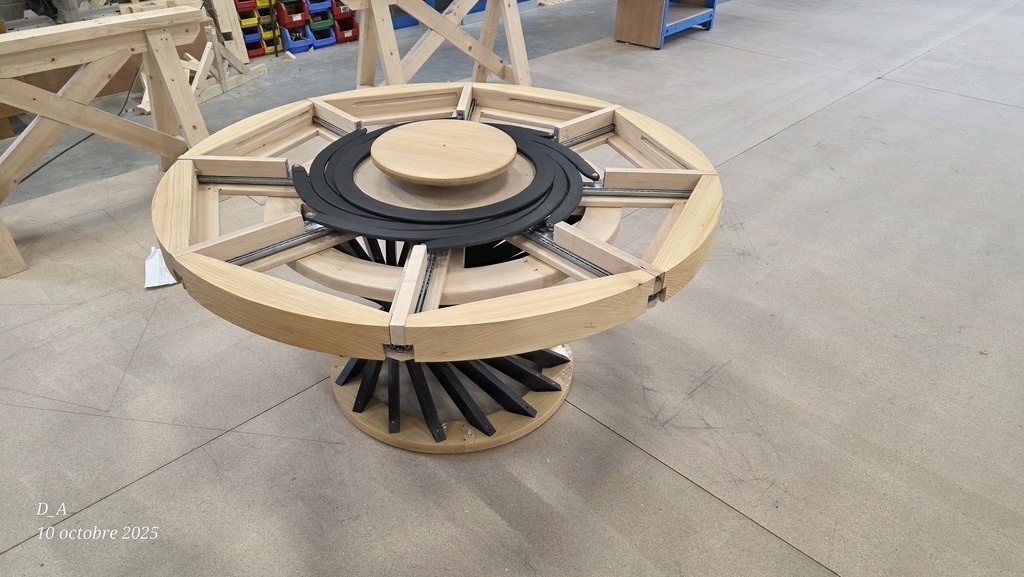 Les rallonges sont stocker à part. Pas de complexité sur la fabrication. Juste galère pour les huit arc du mécanisme afin d'avoir une amplitude de 30cm ( et qui mériterait d'être en métal pour plus de rigidité). La table fait 150cm de diamètre fermé et 210cm ouverte. Pour le placage du plateau, il s'agit de planche de 10mm en hêtre brossé et comme finition juste une résine epoxy avec un colorant noir. 3d de la table le 3d est en format html donc à ouvrir dans une page Web ( pour les processeurs de iPhone ouvrir dans cadwork webviewer (appli). Je vous partagerai les plans en pdf ou dxf là semaine prochaine