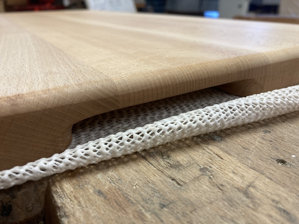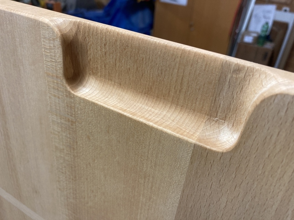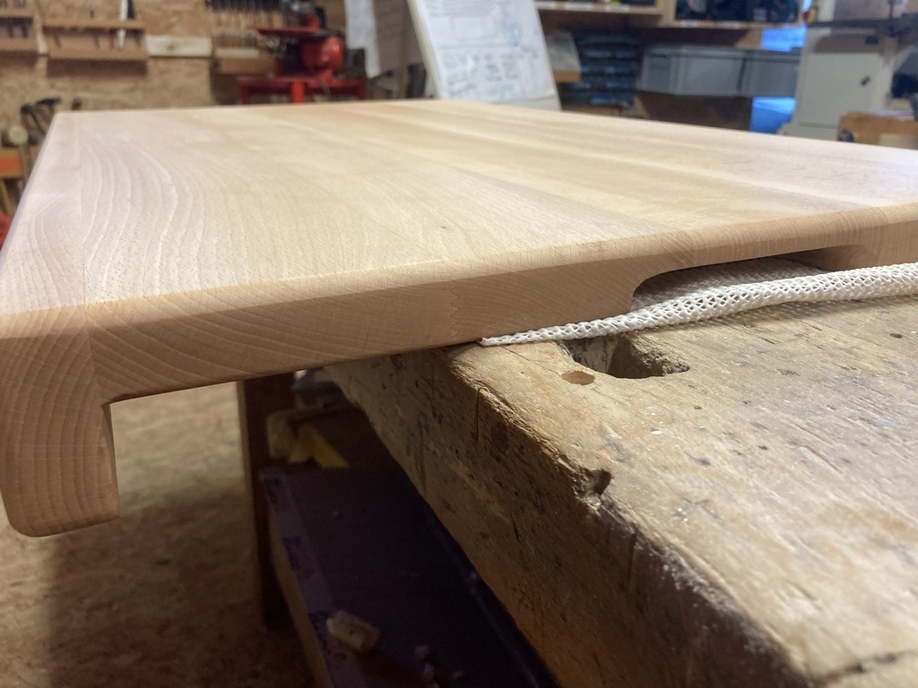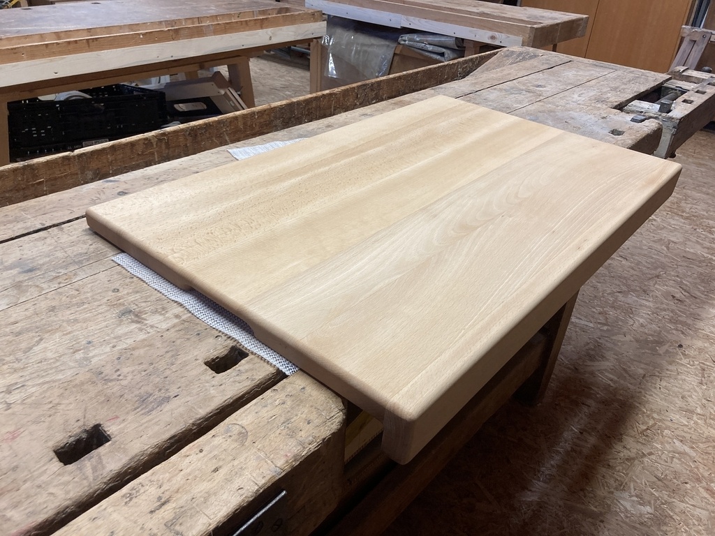 Planche à pétrir en hêtre de récupération de marches d'escalier (majoritairement du quartier sauf un plateau en dosse). Environ 850 x 530 x 28 avec butée de 55 mm. Assemblage par tourillons et domino, puis rabotage des légers désaffleures à la main. Poignées usinées à la défonceuse avec une fraise à gorge et un gabarit. Quart de rond sur toutes les arrête (9 mm ou 4 mm de diamètre). Finissions Rubio transparent