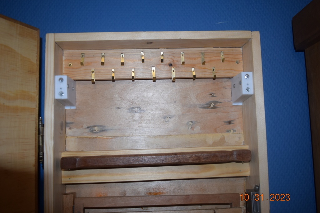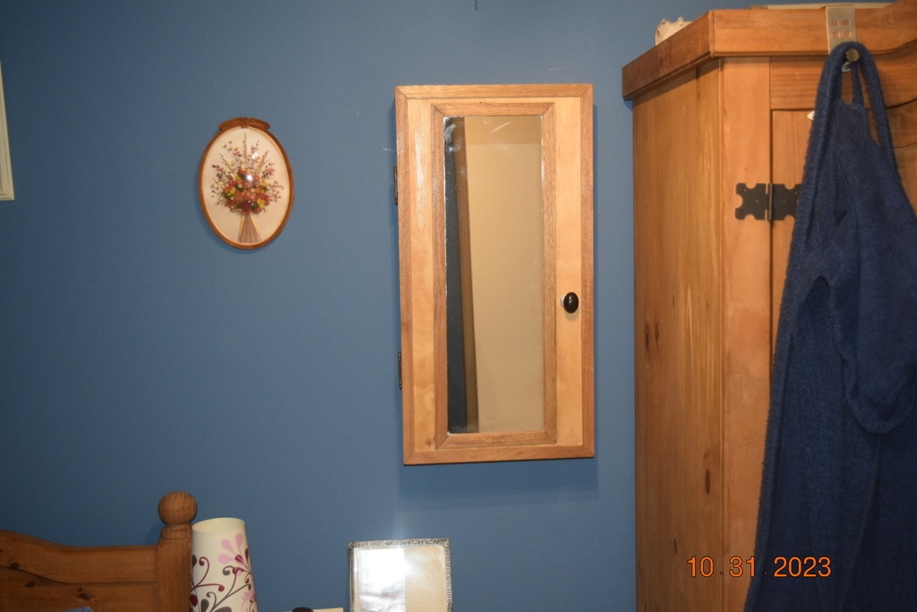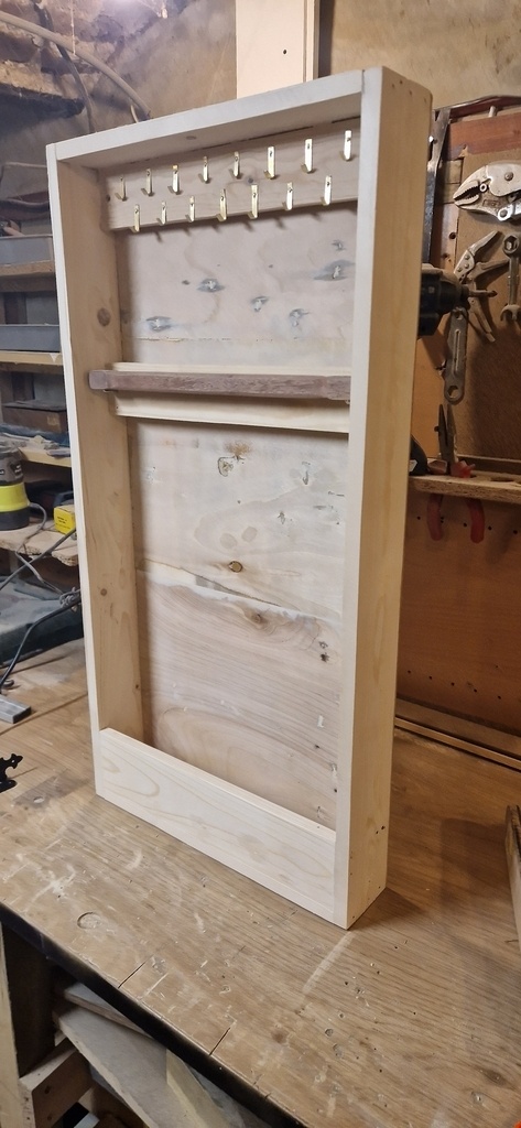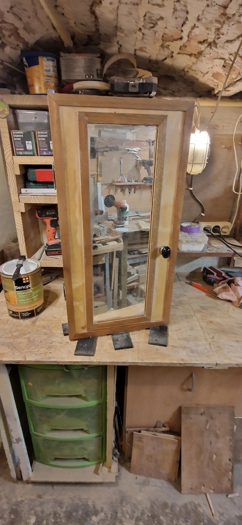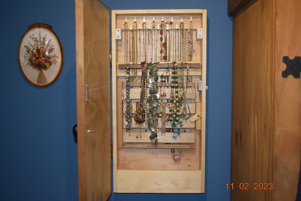 J'ai fabriqué ce meuble à bijoux et colliers pour ma mère il y a environ deux ou trois ans. C'était un projet personnel pour lui offrir pratique et élégant pour ranger ses colliers. Les photos montrent le meuble fermé, avec son encadrement en bois et sa porte miroir, et ouvert, révélant le système de rangement pour les bijoux.