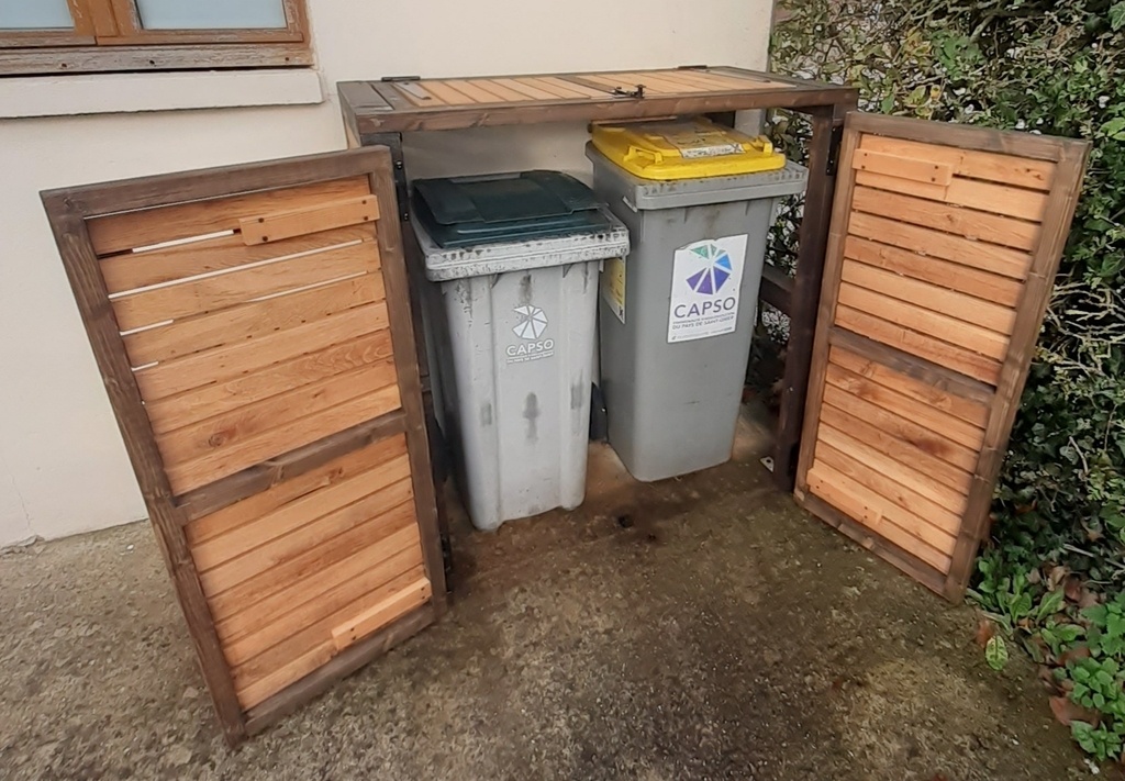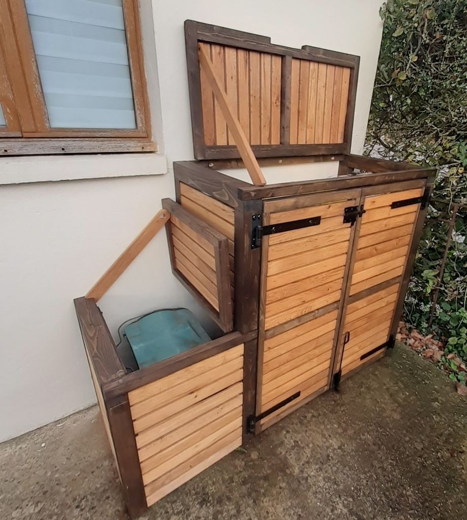 Un cache poubelle avec des chutes de l'atelier et de la récupération.