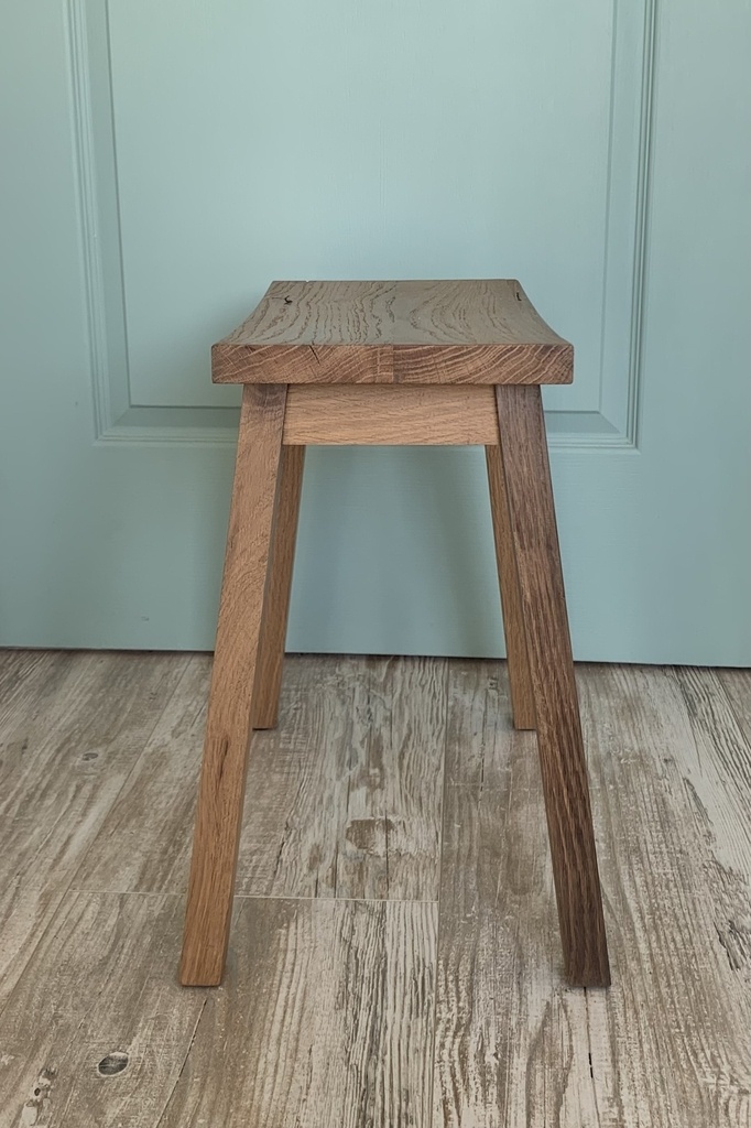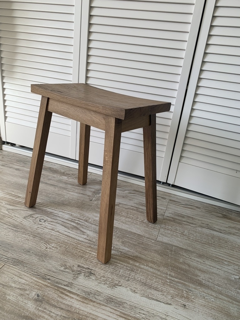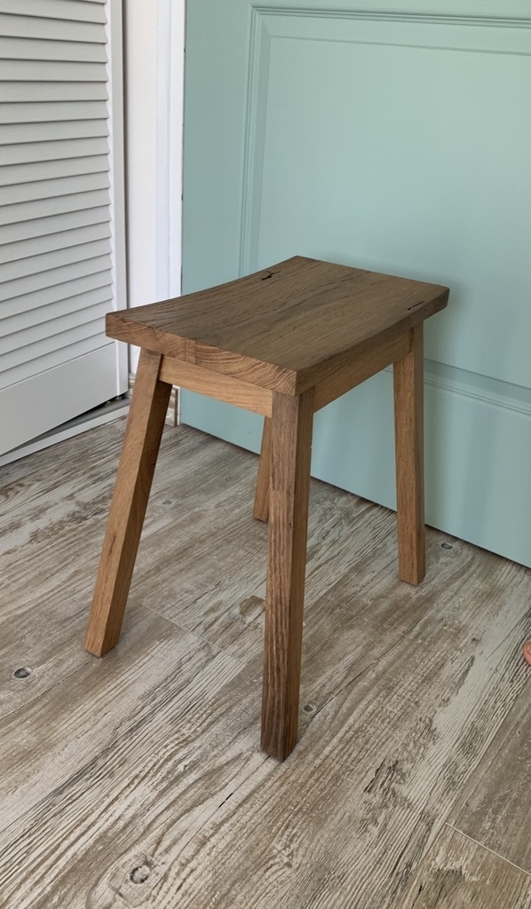Petit tabouret avec les pieds ayant un angle de 7° vers l'extérieur et une assise en courbe. Un léger style japonisant!