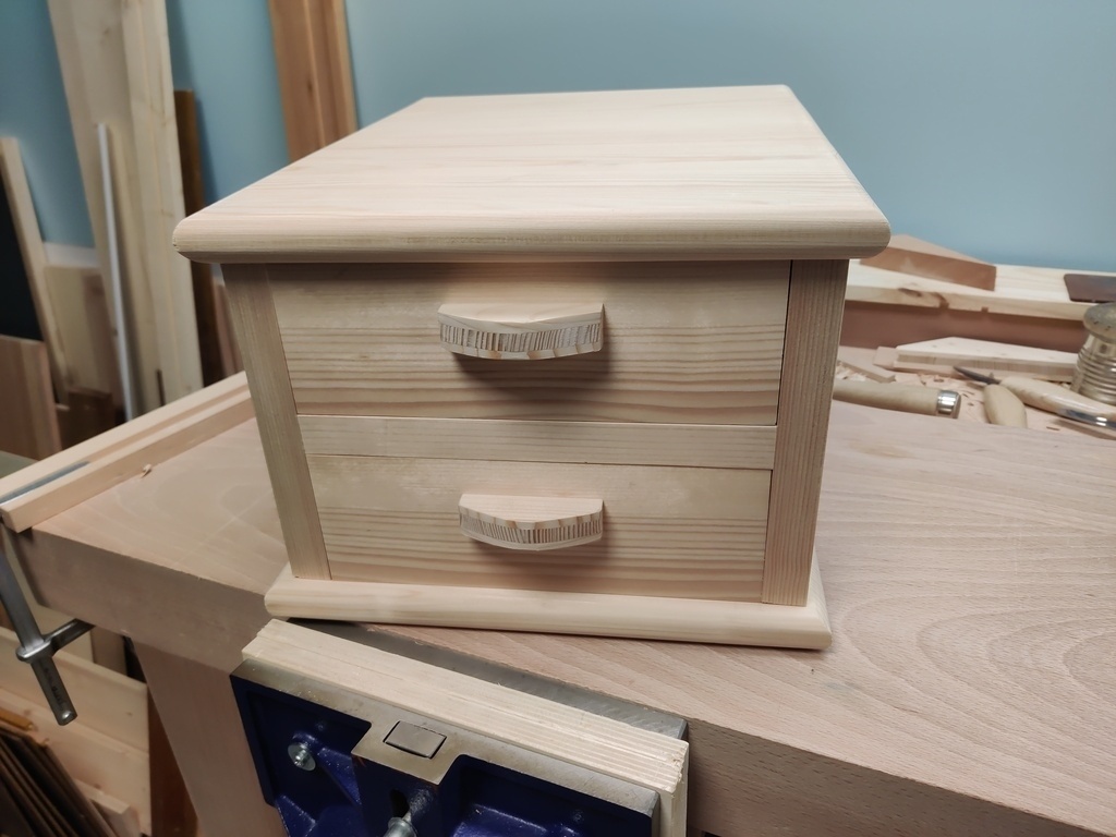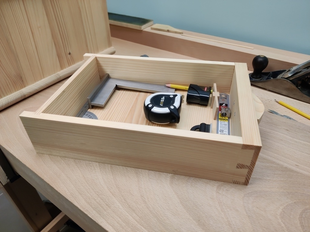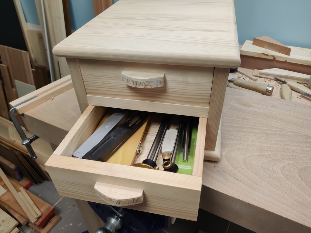 Petit meuble à tiroir pour ranger les outils de mesure et traçage dans l’atelier. Basé sur un modèle de Paul Sellers.