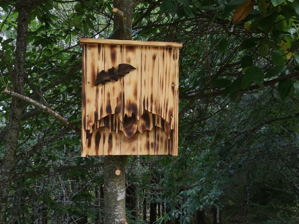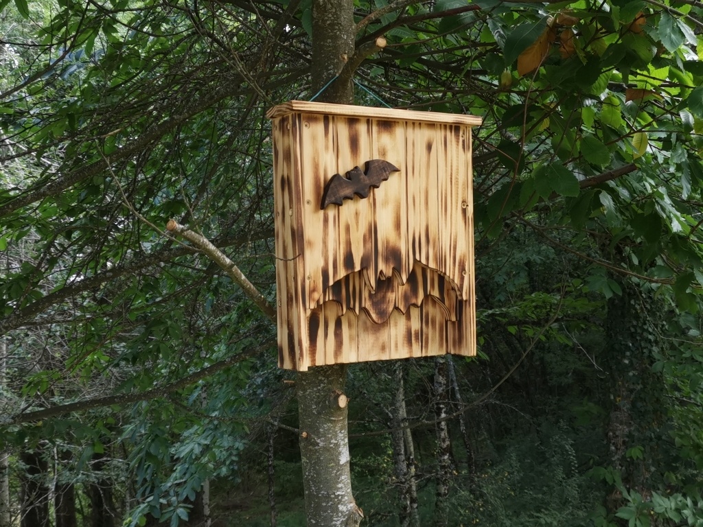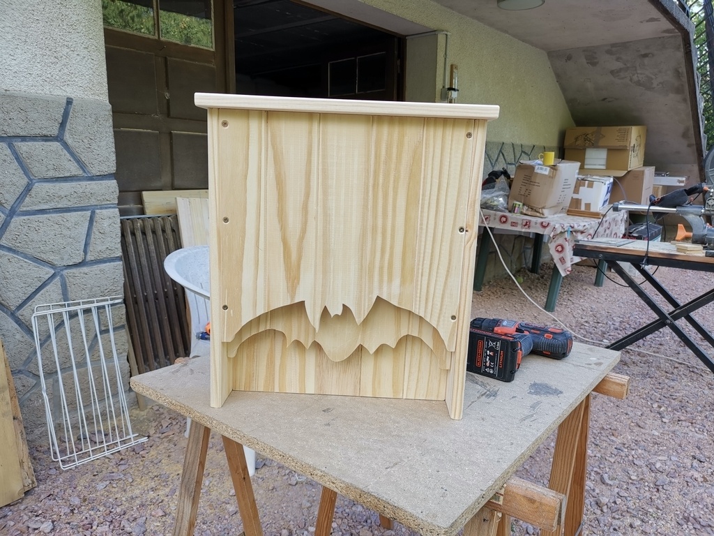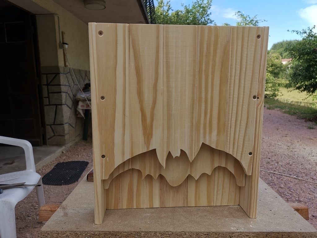 bonjour a tous voici un nichoir chauve souris en bois fait avec des lattes de sommiers donc en pinla couleur et effet brulé et l'effet 3D est pas mal non plus