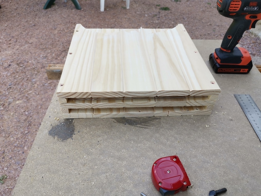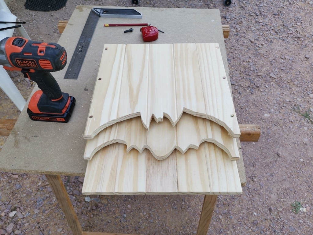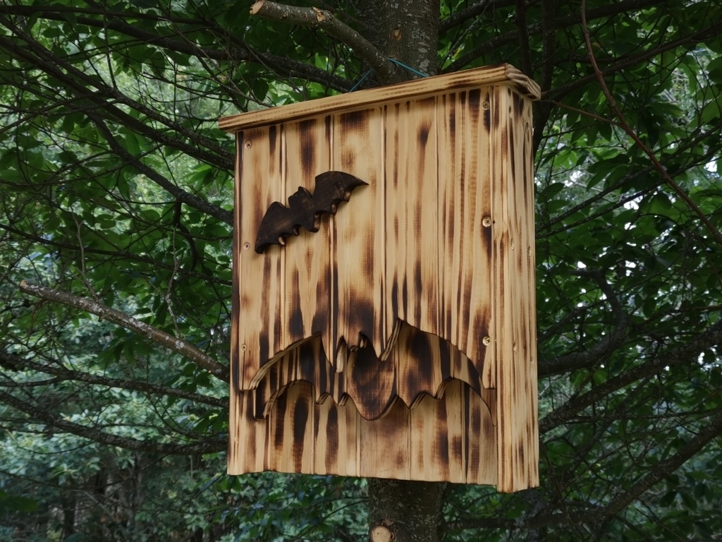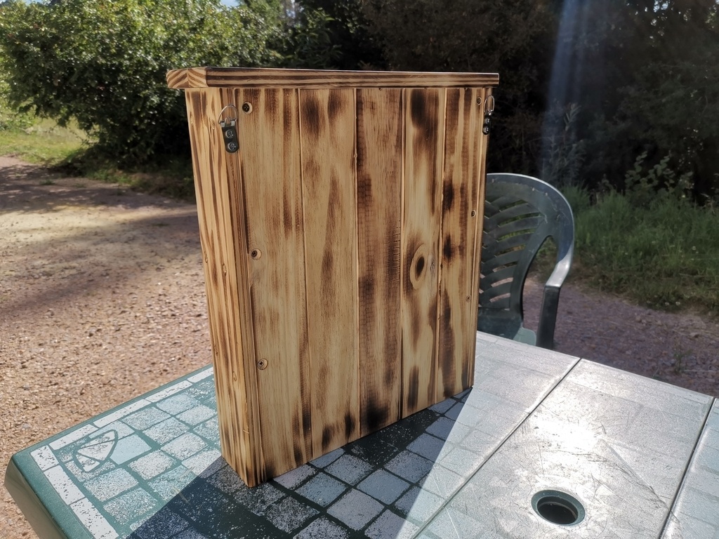 bonjour a tous voici un nichoir chauve souris en bois fait avec des lattes de sommiers donc en pinla couleur et effet brulé et l'effet 3D est pas mal non plus