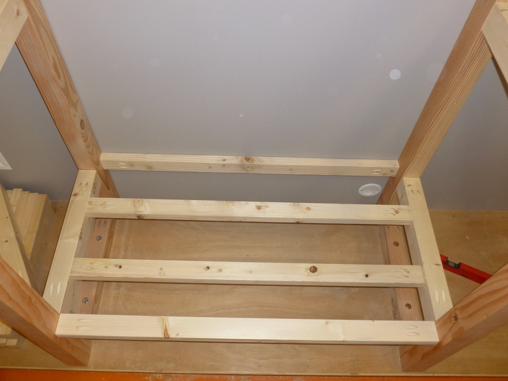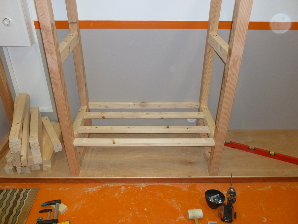 Ensuite, j’ai fais les étagères avec des lambourdes rabotées et dégauchies. (J’étais d’ailleurs ainsi que j’ai inauguré l’acquisition de ma rabo-dégo Bernardo.) Elles sont également assemblées à la structure avec le système Kreg.