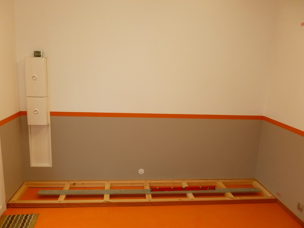 L’assise est réalisée avec des chevrons posés à l’horizontal et visser au sol. Ce qui a l’avantage d’éviter les pieds simples avec tout ce qui peut se glisser de saleté dans le vide.