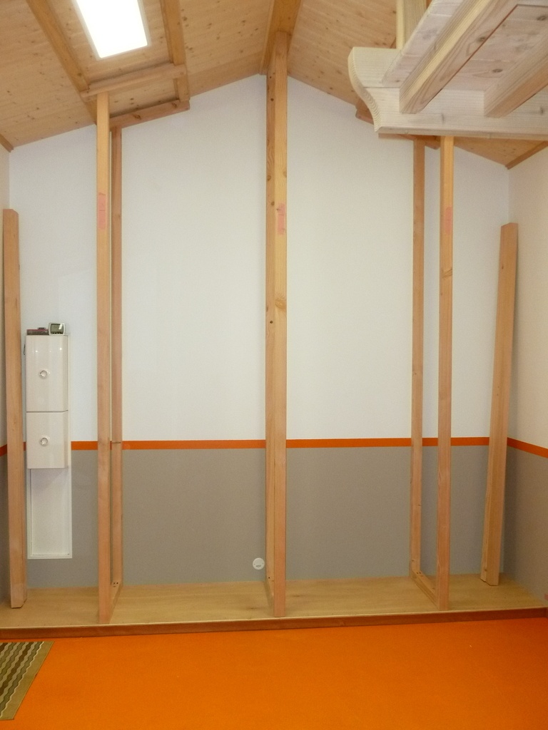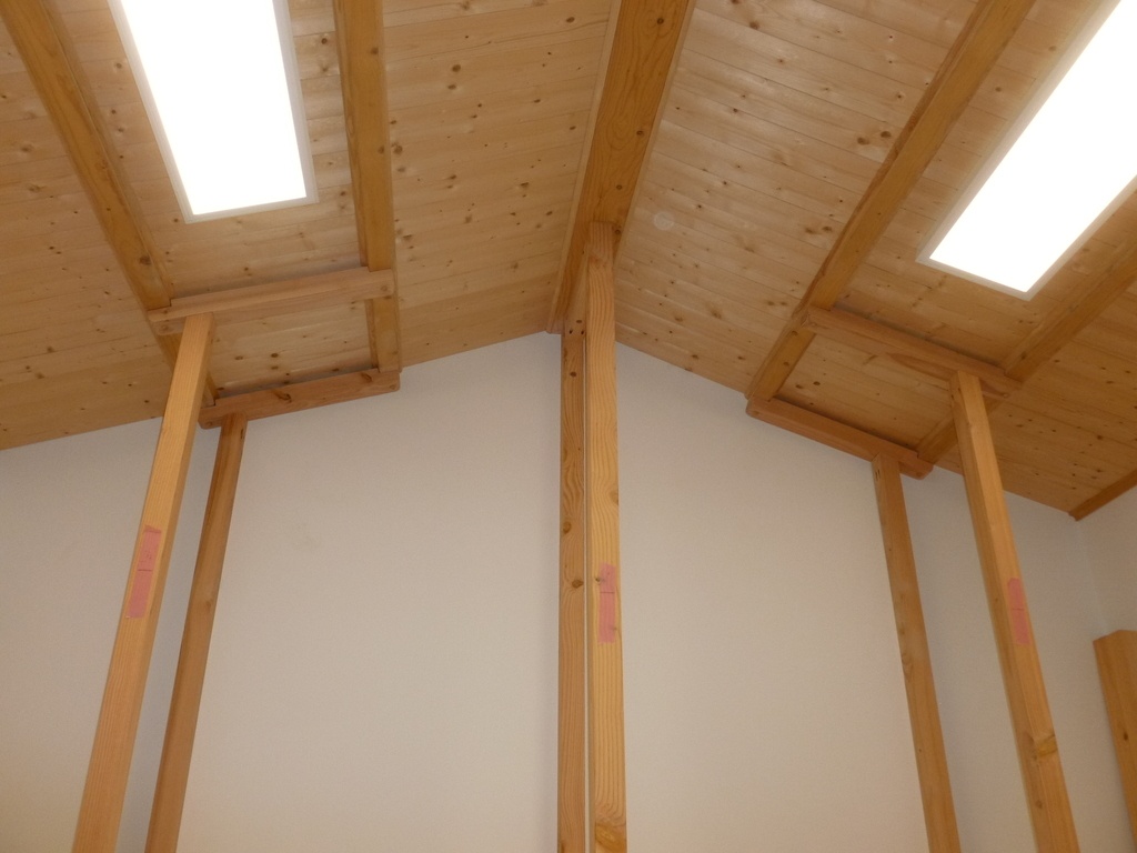 Puis J’installe des chevrons en verticale qui vont donner la structure. Ils sont vissés dans l’assise et au plafond. Ceux du milieu, dans la poutre faîtière. Et ceux du côté dans les pannes intermédiaires par l’intermédiaire de chevrons entre. Enfin, les chevrons contre le mur sont vissés dans l’assise et dans des renforts en OSB vissés dans la structure en métal du placo. (Oui, j’avais prémédité ce coups là…)