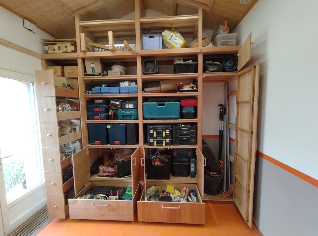 Les rangements, c’est comme les serre‑joints, on en a jamais assez. Et les rangements, c’est d’autant plus important quand on a un espace limité… Pas vrai ? Du coup, je me suis fait cette grande étagère qui prend tout un pan de mur.
