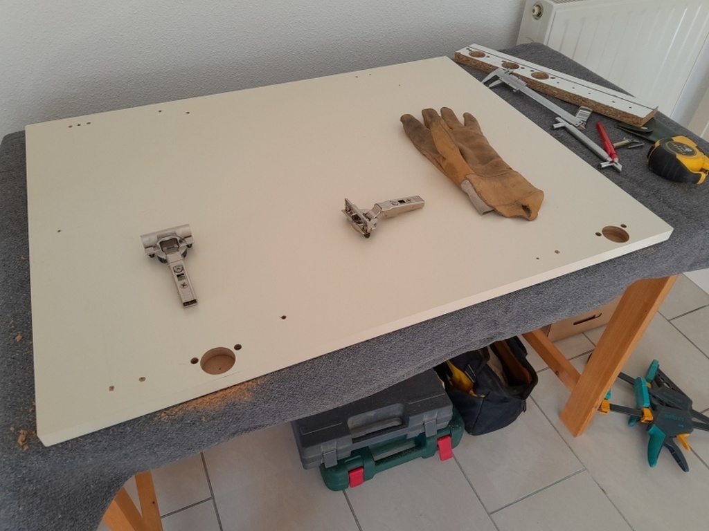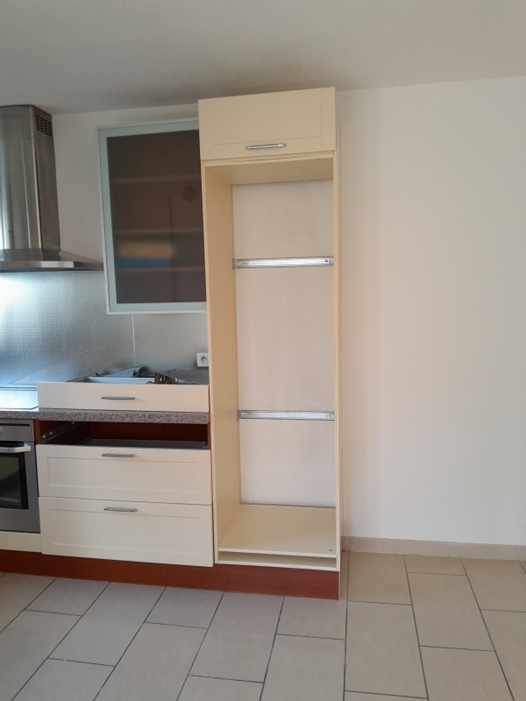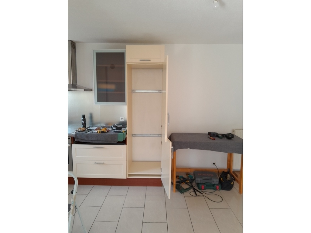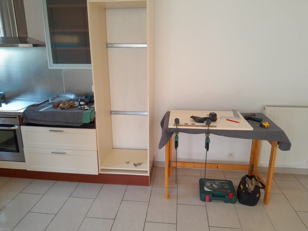 Appartement vide entre deux locations, et le frigo intégré est HS. La propriétaire me demande de lui réaménager le caisson en étagères standard et de remettre les portes en place avec des charnières (car d'origine elles étaient fixées au frigo.