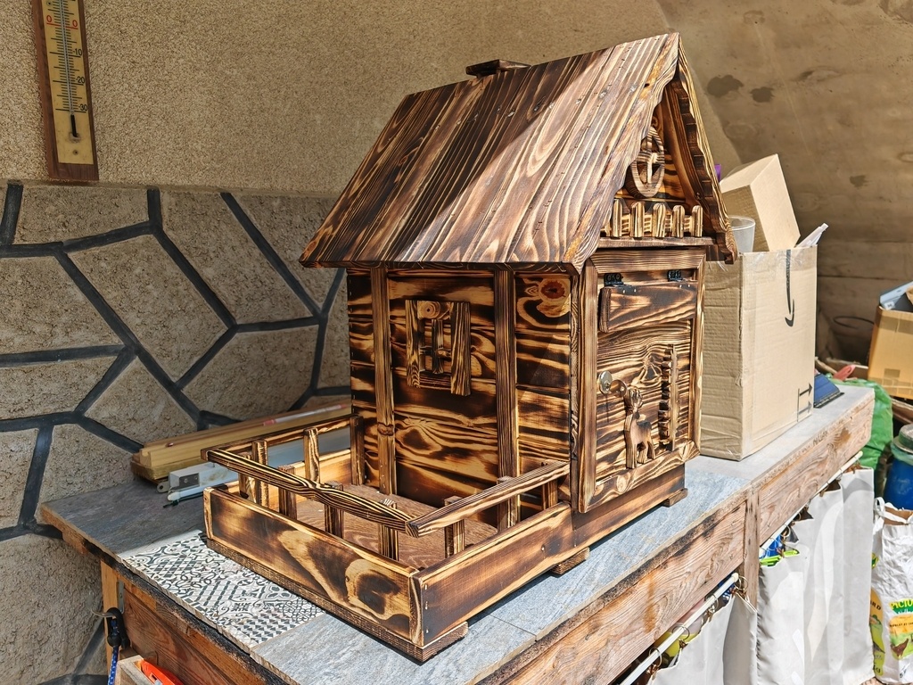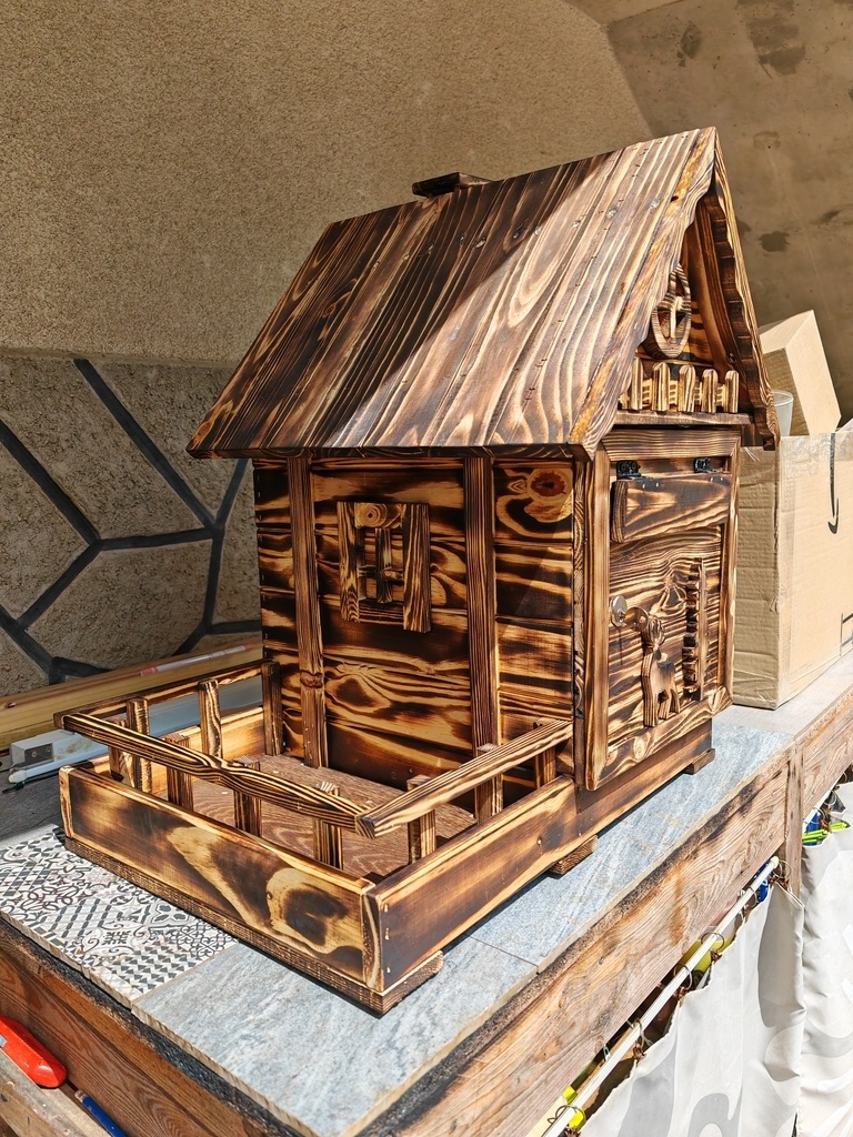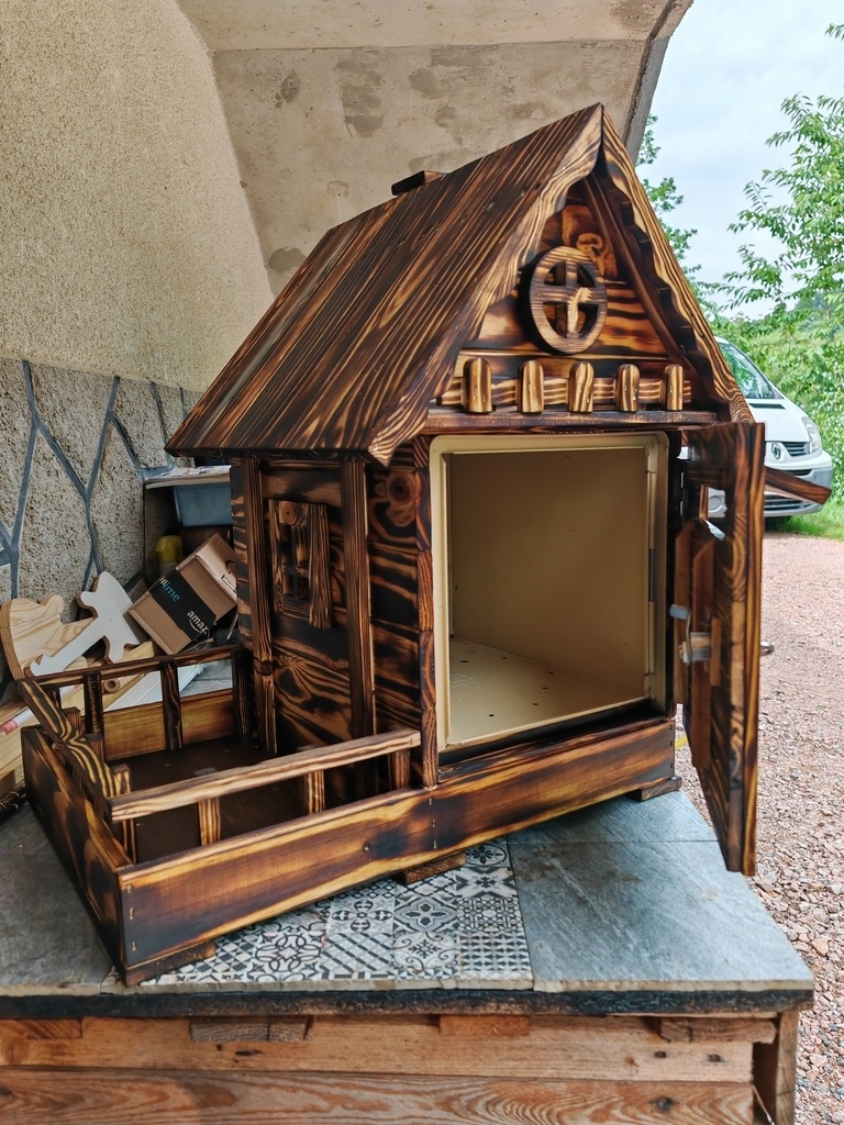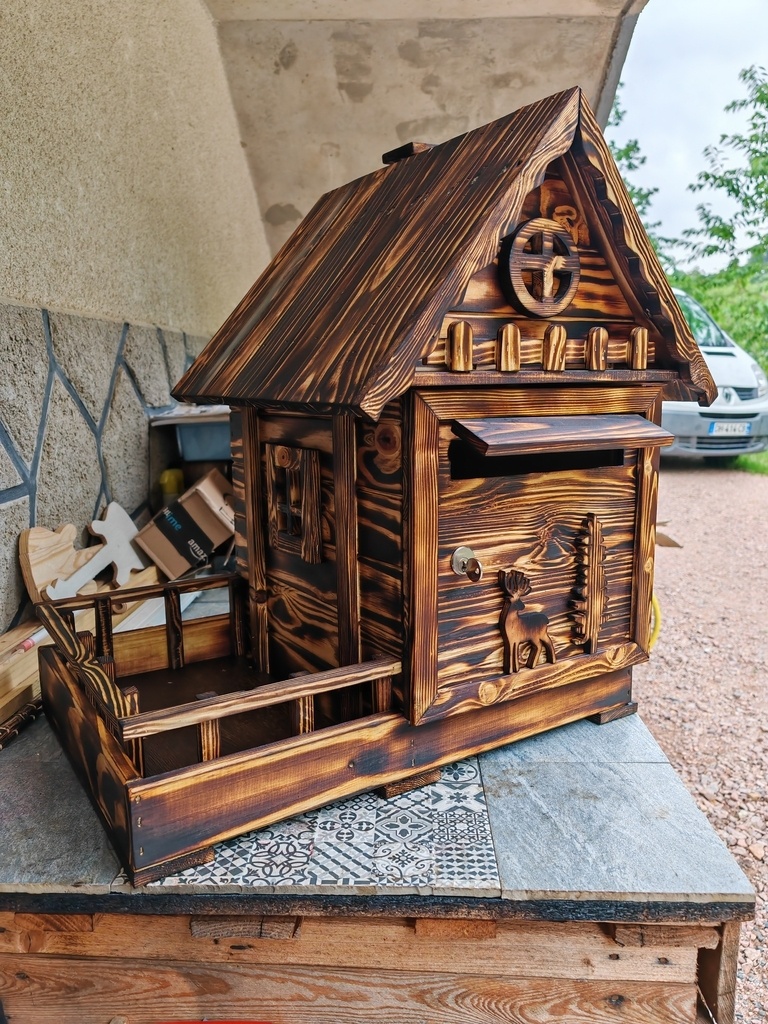 bonjour , voici un nouveaux habillage pour boite a lettres en bois de palette effet brulé , style chalet savoyard avec une balconnière pour mettre une barquette de fleurs l'été , quelques petites décos habille l'habillage