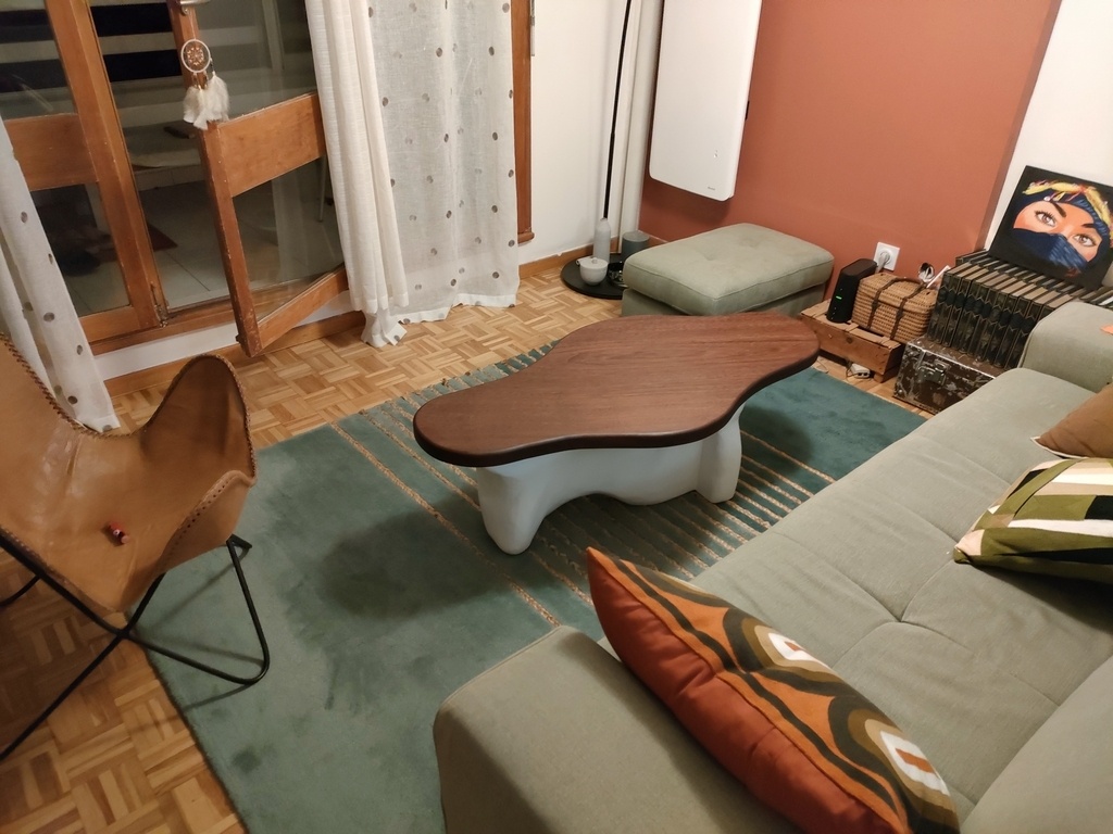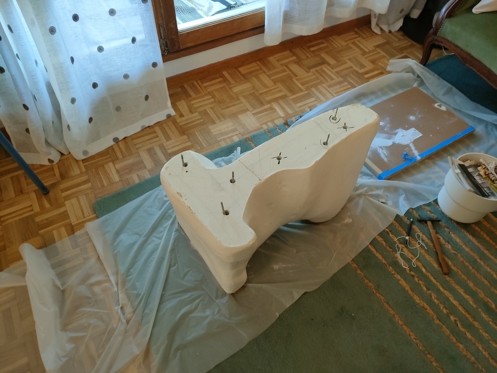 Finition huile de noix. Je dois vous avouer qu'il y a eu plusieurs semaines (peut etre même des mois) entre le plateau et le pied. Le plateau est resté sur ma loggia et j'ai du y passer mille couches d'huile, tous les matins, tous les soirs.