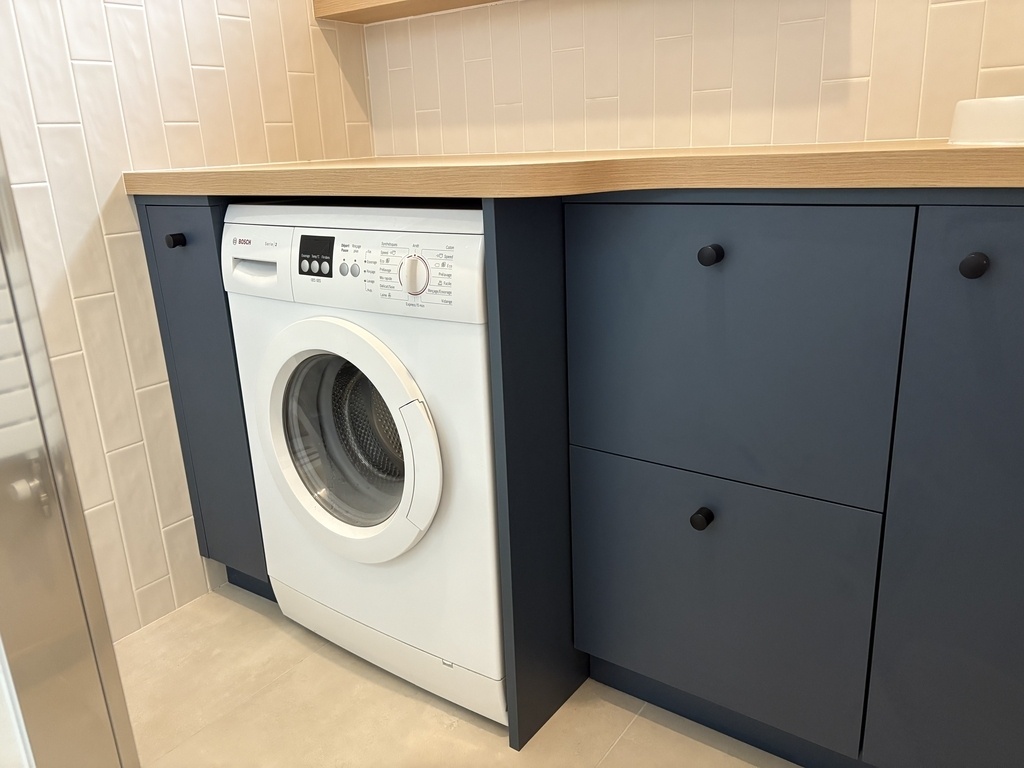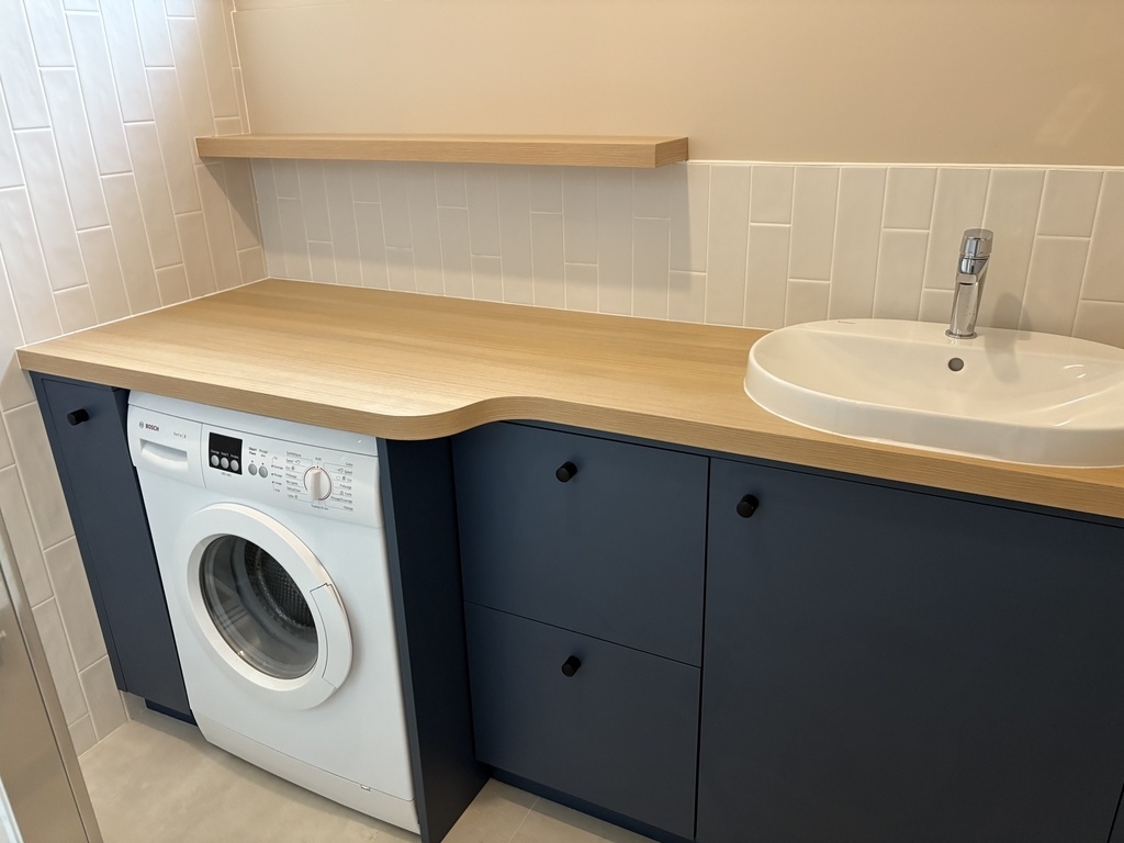 Je vous partage ma dernière réalisation sur mesure d’un agencement de meuble de salle de bain en melaminé