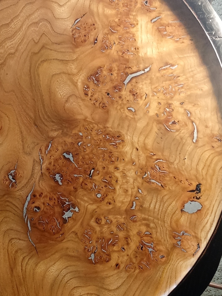 Il s'agit de deux méthodes que j'utilise régulièrement pour combler les fissures, comme cette loupe en présentait beaucoup, j'ai voulu mixer les deux pour éviter une surcharge visuelle de "trop d'argenté" ou "trop de noir". Je trouve que les deux se complémentent bien sur ce bois, et - merveille de la sérendipité - l'utilisation du charbon crée un micro liseré noir autour des inclusions d'étain qui les font encore mieux ressortir que lors d'inclusions "simples".