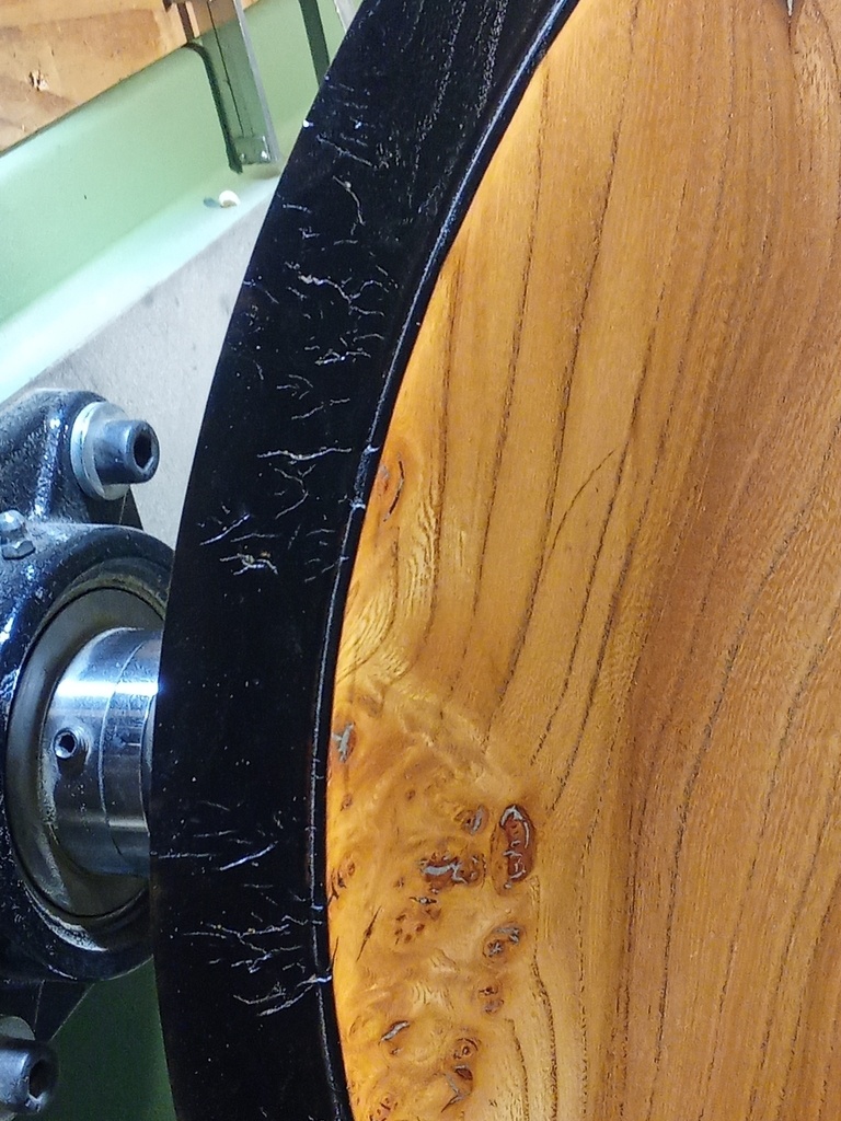 Le bord extérieur est brulé au chalumeau, légèrement brossé pour faire ressortir le grain du bois puis le charbon est fixé à la gomme laque (gomme laque astra en forte dilution à 100g/L)