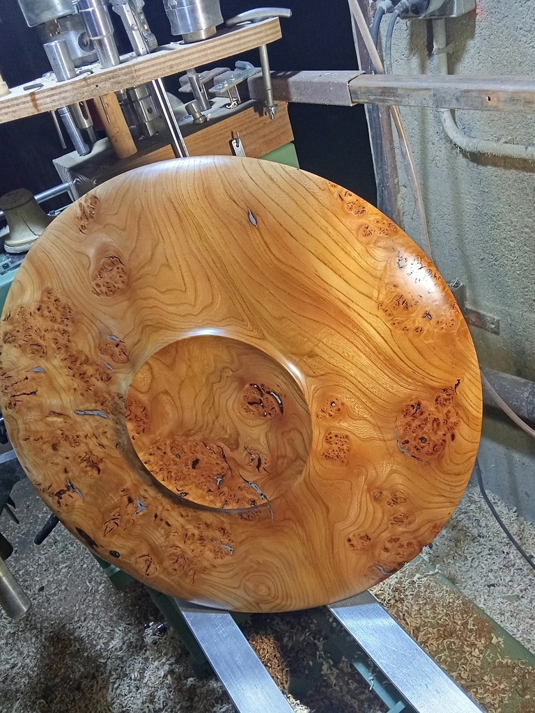 Ensuite j'ai eu cette année de petits coups de pied au c** qui m'ont fait franchir le pas : j'ai eu la chance de récupérer de magnifiques morceaux de bois, très gros mais tellement magnifiques que ça m'aurait fait mal au coeur de les couper en plus petits pour accommoder les capacités de mon tour précédent ; un client m'a demandé si j'étais capable de faire une baratte à beurre de 1m de diamètre à offrir pour les 80 ans de sa grand mère (bretonne) en remplacement d'une baratte centenaire qui a fini par rendre l'âme.