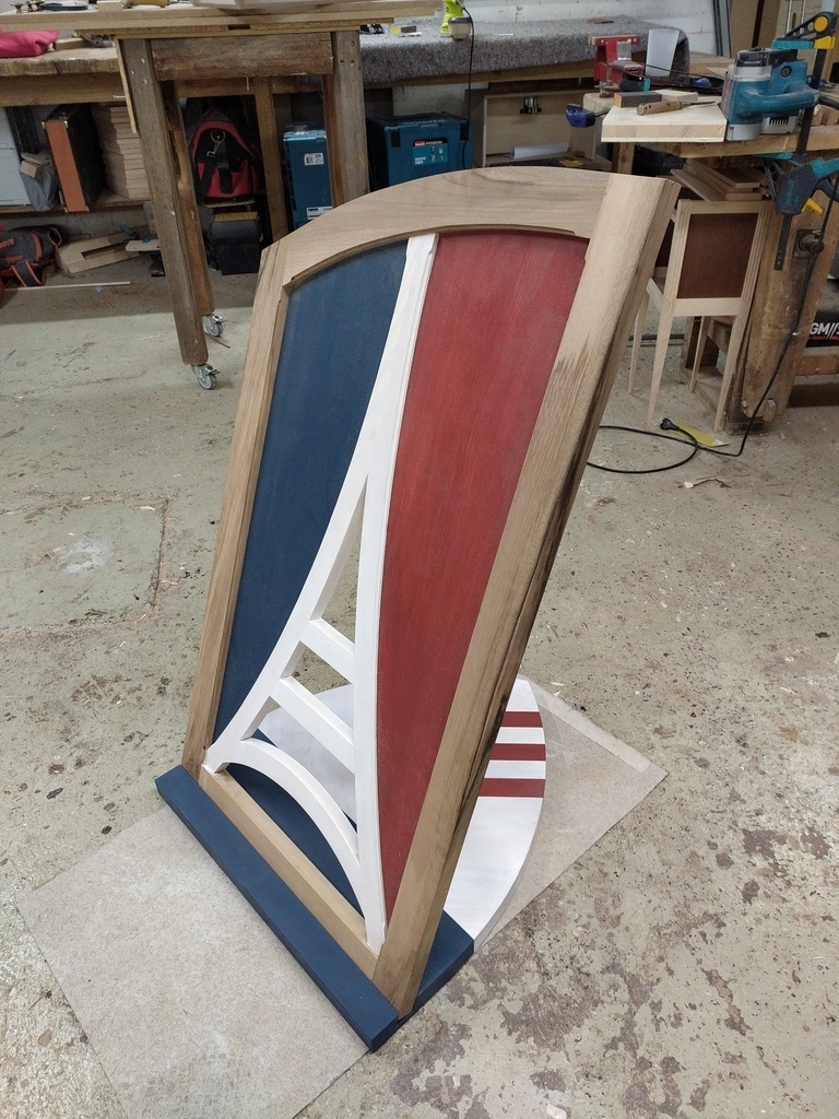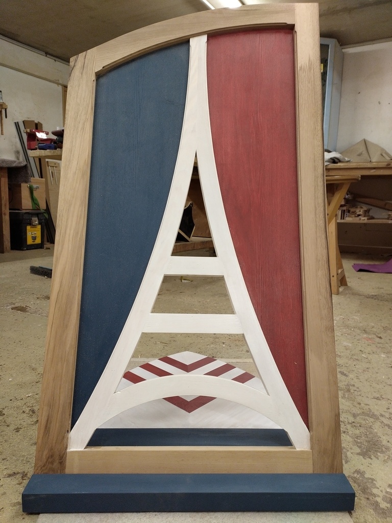 Réalisation de cette décoration inspiré de la Tour Eiffel. Avec un cadre en noyer, panneaux et Tour Eiffel en frêne avec une finition Wood Cream de chez Rubio. cette maquette représente la France et son monument. Le socle de présentation représente le blason de l'Eure et Loire, ma région natale.