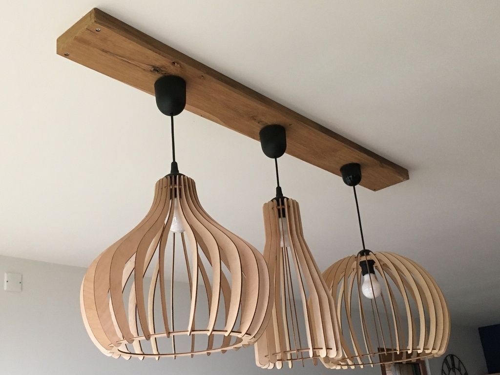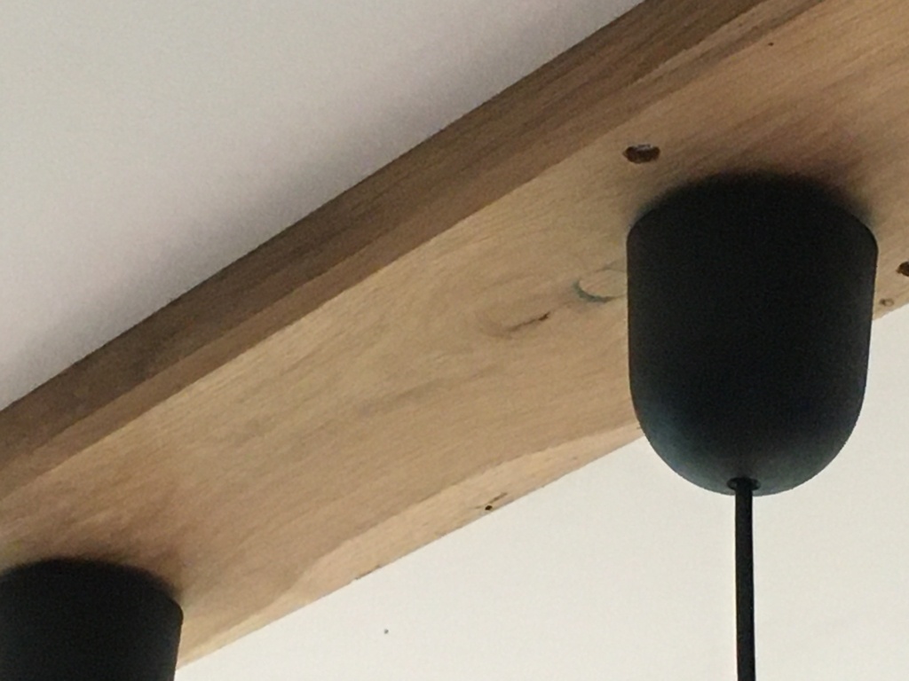 J'ai réalisé ce support en chutes de vieux chêne. Tout simple. Les lampes ont été achetées. Ca rend tres bien dans une pièce constituée de rappels de bois.