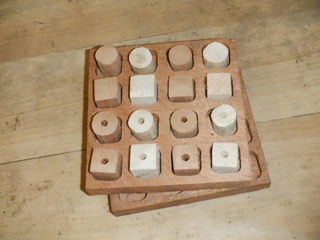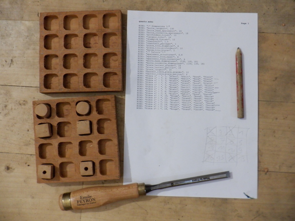 Lorsque j'étais en classe de seconde (en 1994-1995), j'avais des cours de productique, sur des machines-outils qui permettent de travailler le métal au 1/100ème de mm avec des manivelles. Parmi les exercices, le prof nous avait fait réaliser un jeu de quarto (légèrement adapté) avec plateau en PVC fraisé, et pièces tournées dans du laiton ou de l'aluminium.