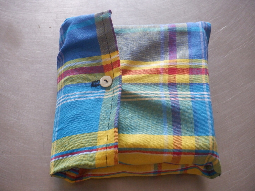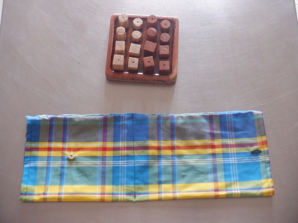 J'ai aussi cousu une pochette de rangement en tissu madras (très courant localement), séparée par une couture centrale. Elle accueille d'un côté le plateau, de l'autre les pions.