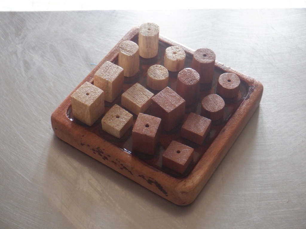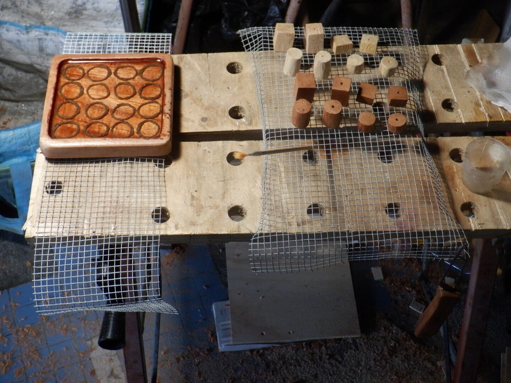 Comme le précédent, j'ai pioché dans mes chutes de bois de construction navale. Le plateau est en mahogany ou acajou pays, et les pions du même bois pour les sombres, et les clairs sont en poirier pays ou acajou blanc.