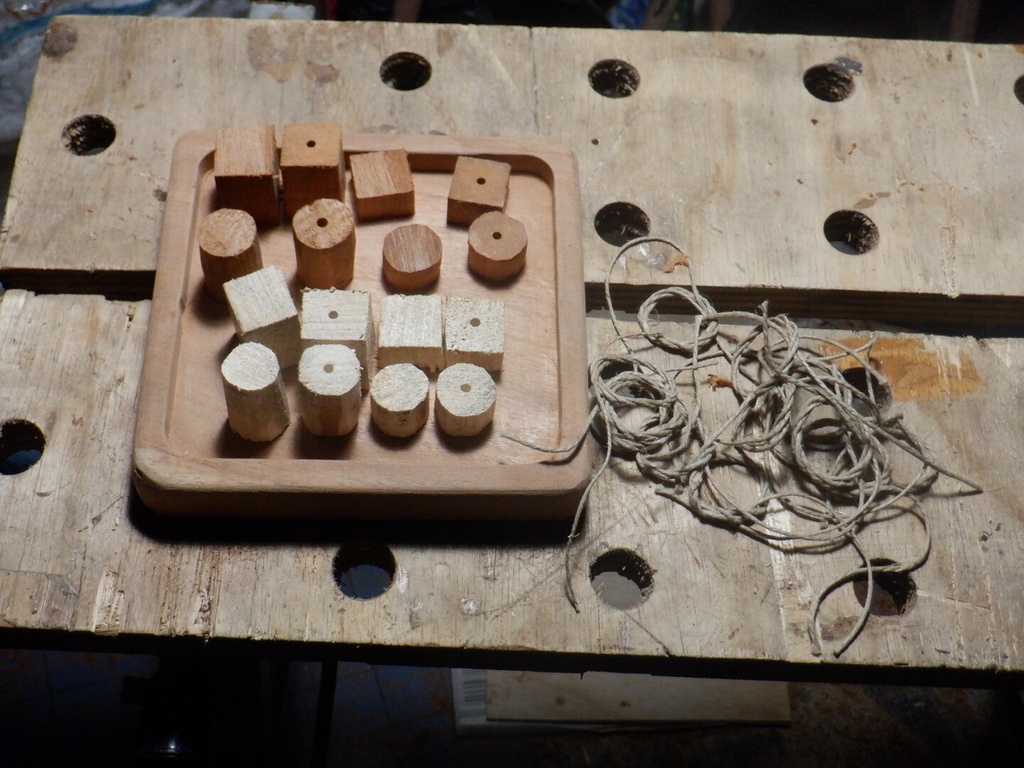 Dans le plateau j'ai fait une défonce dans laquelle j'ai disposé 16 erseaux textiles classiques en cordant sur 3 tours une ficelle de lin. Un petit travail de matelotage qui est un de mes loisirs. Puis j'ai coulé de la résine époxy transparente. Ensuite j'ai verni le tout.