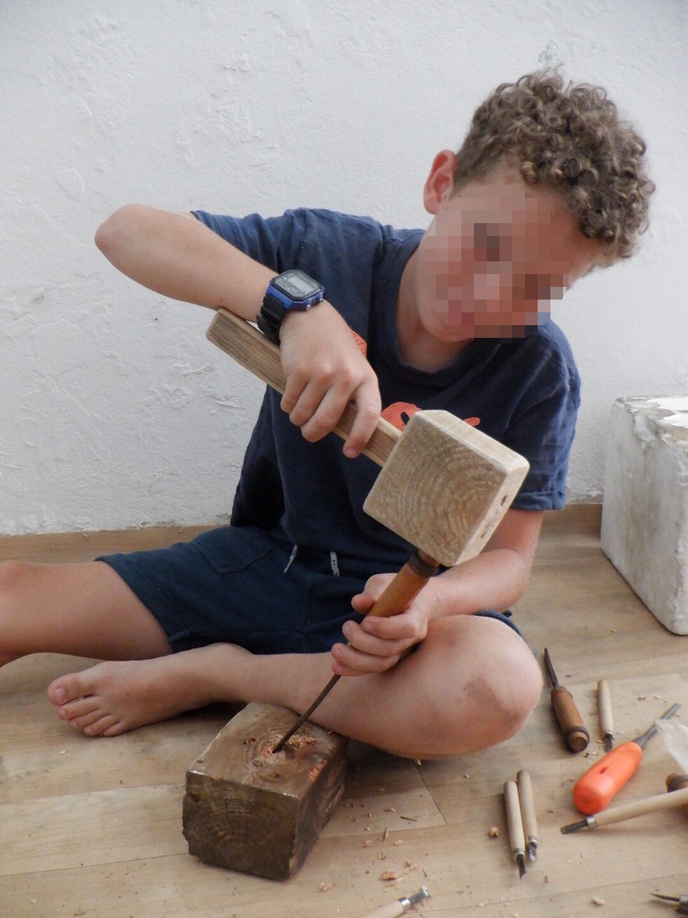 Mon fils de 13 ans avait quelques outils chez sa mère mais un jour il était chez moi on bricole un truc, j'utilise mon maillet et il réalise que ça lui serait utile. Je lui dis que je viens d'en voir des Stanley en bois à 40 € dans le magasin. Un peu excessif à notre goût. Ni une ni deux, je lui sors un cube de palette déjà démonté, une vieille chute de tasseau de pin, on a creusé une mortaise (probablement dégrossie à la perceuse et finie au ciseau) et hop, voici un maillet bien utile, quasiment identique au Stanley, sans dépenser un centime et sans forcément y passer plus de temps qu'en allant au magasin. Il l'utilise depuis 5 ans, et il vient de commencer un apprentissage de menuiserie