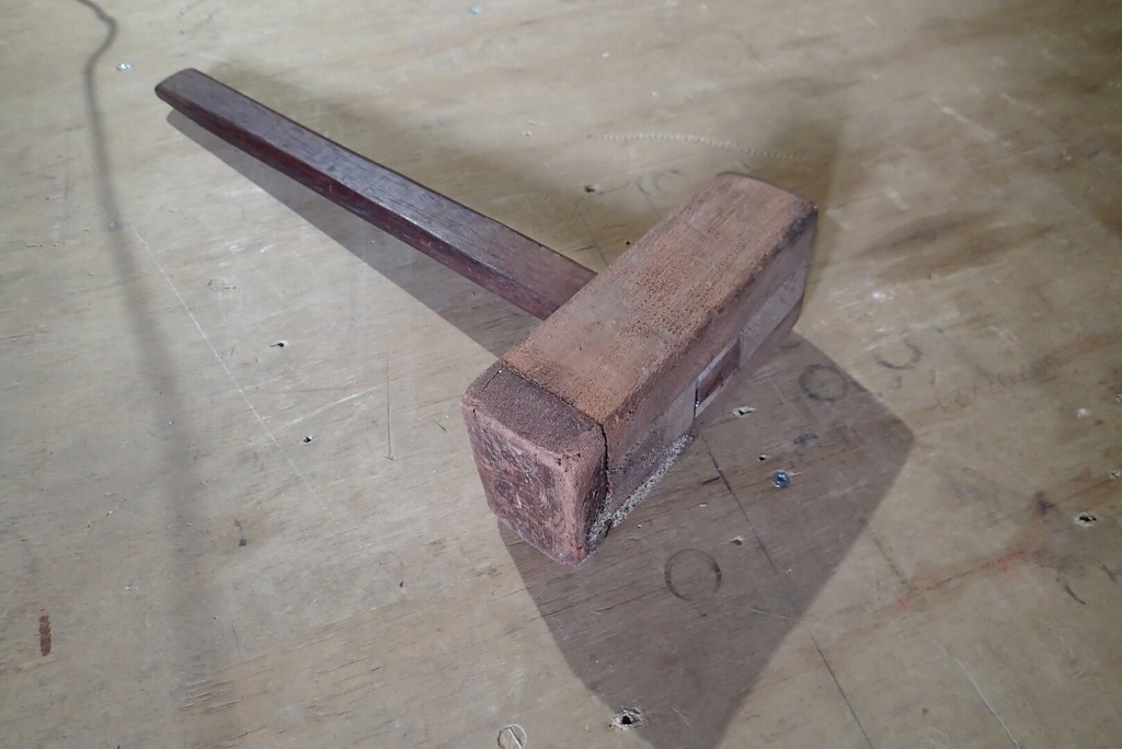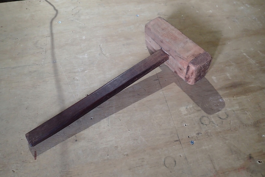 Mon bateau en bois était en chantier, mais pas chez moi. Un jour j'y étais, et je réalise que parmi mes outils apportés, je n'ai pas mon maillet (le classique du magasin, en caoutchouc). Bon, pour aujourd'hui une chute de bois fera l'affaire mais ensuite je n'ai pas envie de faire faire à mon maillet des allers-retours entre chez moi et mon bateau, déjà qu'il est plus très en forme et que je peux en avoir besoin aux deux endroits.