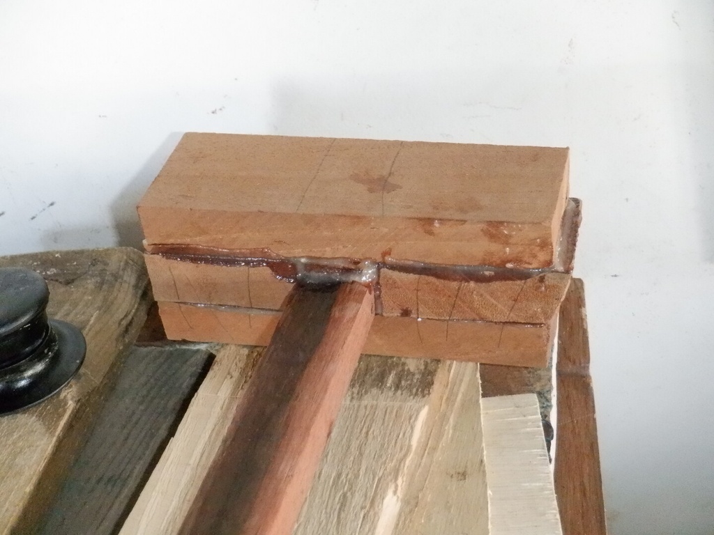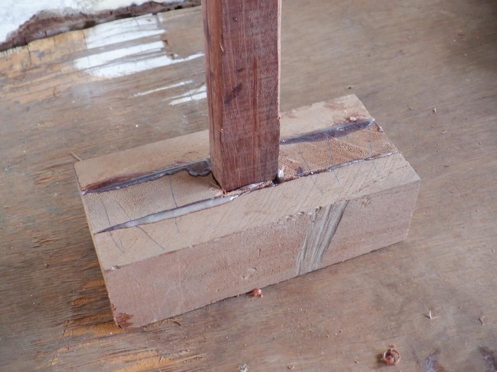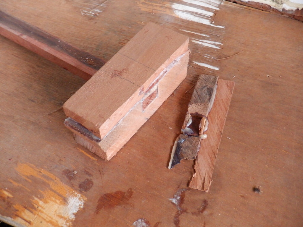 Bon à force de faire des «ajustements précis à grands coups de maillet», l'extrémité que j'utilisais la plus s'est vite abîmée, surtout les flancs en bois de bout assez tendre. Alors je lui ai rapidement ajouté une plaquette de bois rouge qui présente son bois de fil, et assemblée avec 2 tourillons et résine époxy pour être sûr qu'elle ne prenne pas la poudre d'escampette pendant une séance de torture.