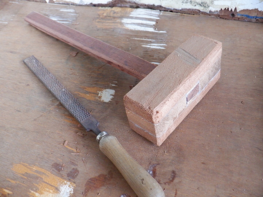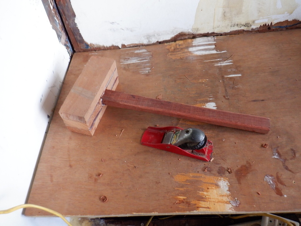Quelques jours plus tard je retourne travailler sur mon bateau, et je fais les finitions du maillet. Quelques coups de scie pour un corroyage approximatif, quelques coups de rabot et de râpe, puis un petit ponçage.