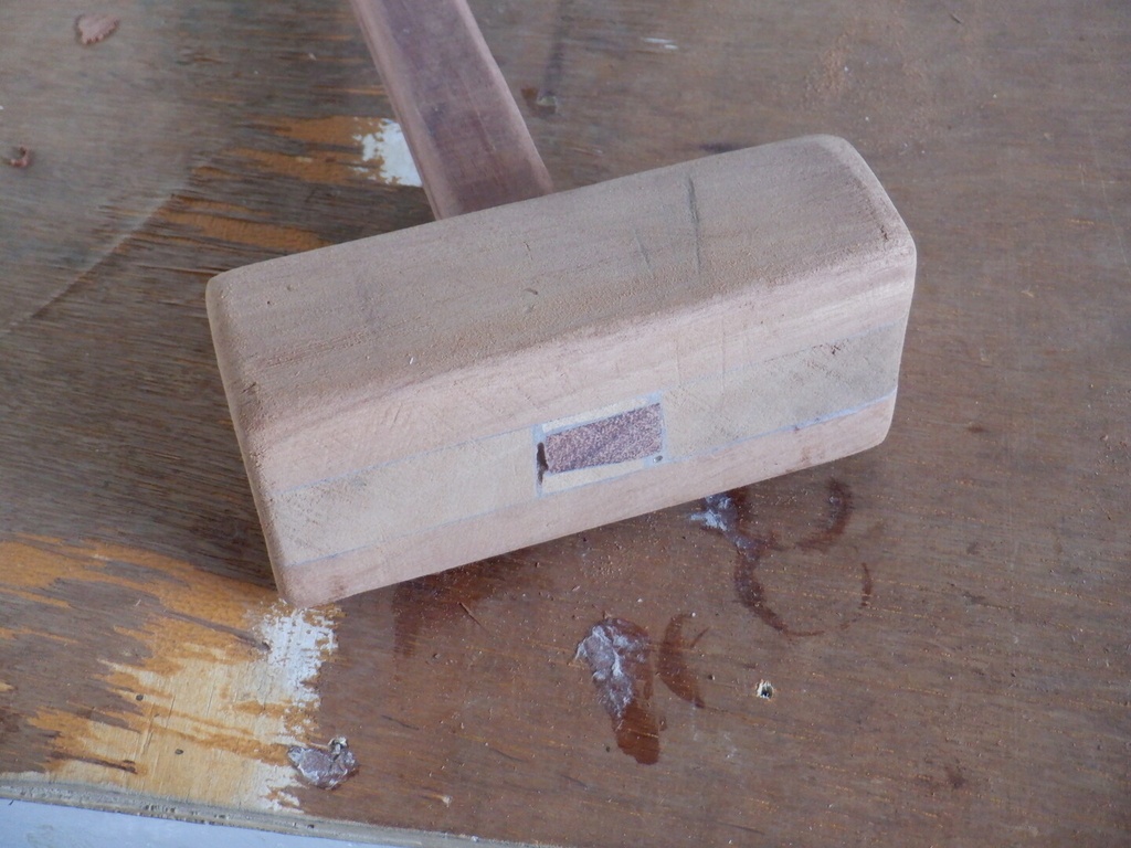 J'obtiens un maillet assez léger mais avec son manche un peu plus long que la moyenne il peut taper assez fort sans difficulté, tout en étant très maniable. Pour le rendre incassable, au lieu de faire la tête monobloc elle est en 4 parties autour du manche, et j'ai croisé les bois comme dans un CP, les flancs sont perpendiculaires aux cœurs.