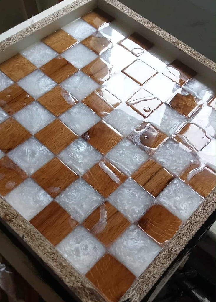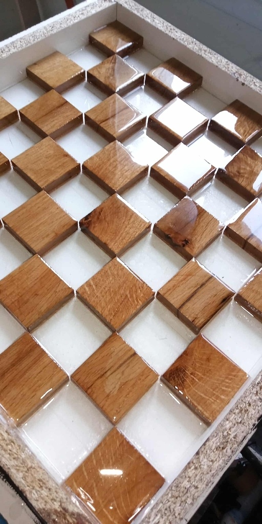 coulage d'une fine couche d'epoxy transparente, que le badigeonne sur le dessus et sur les cotes des cases évite les fuite, colle les cases , bouche les pores du bois évite le degazage