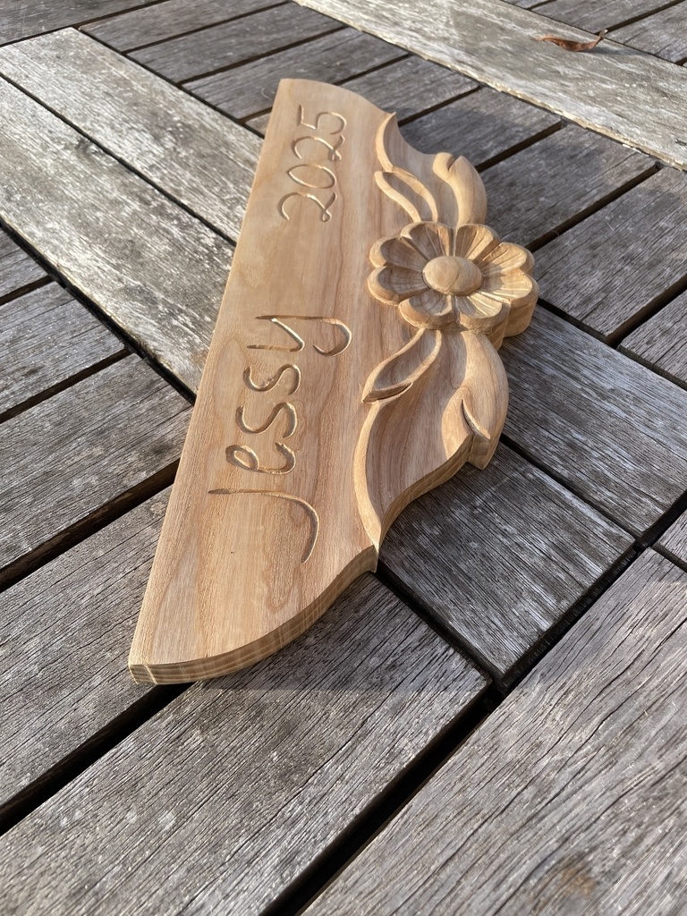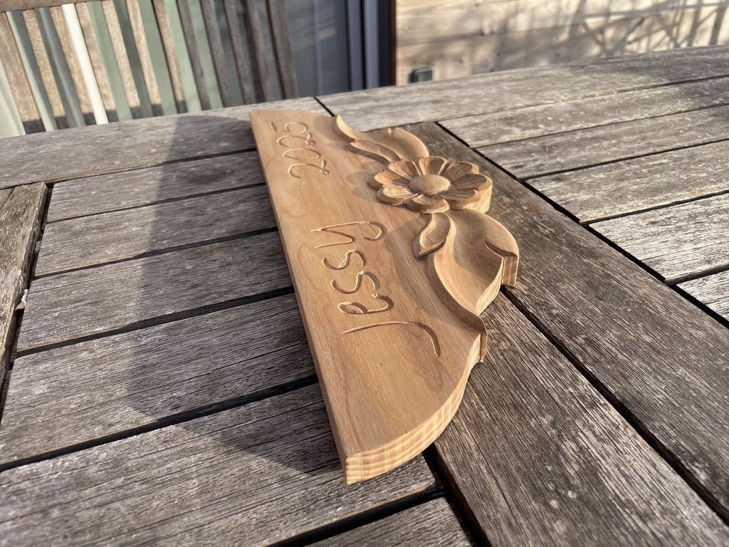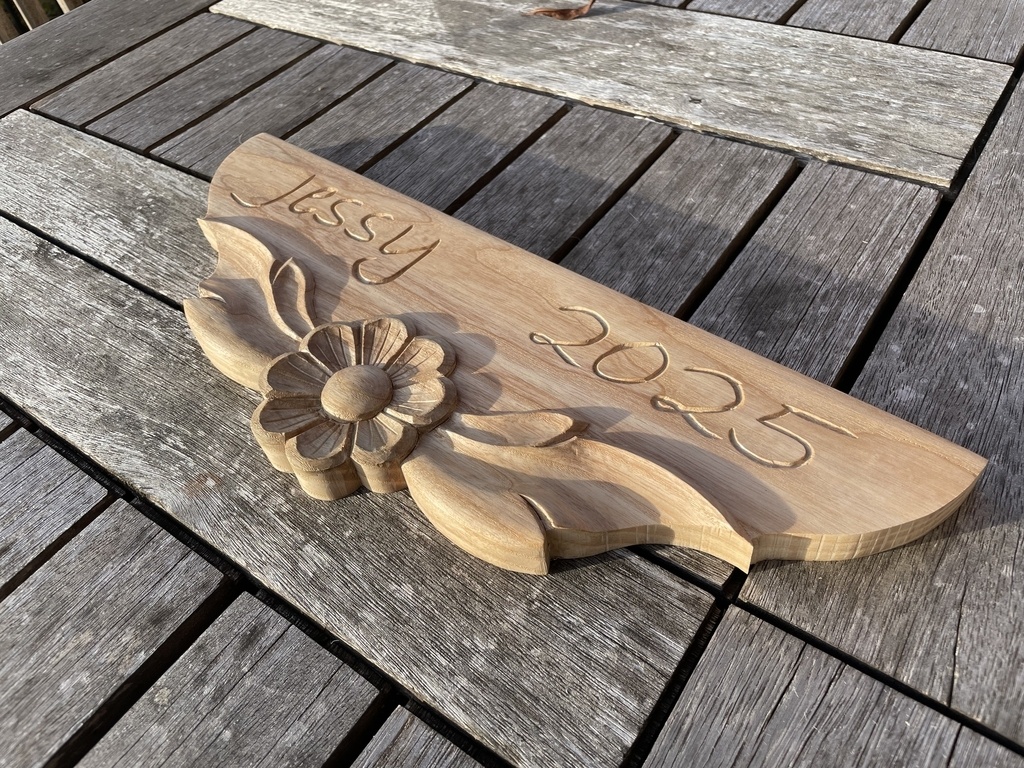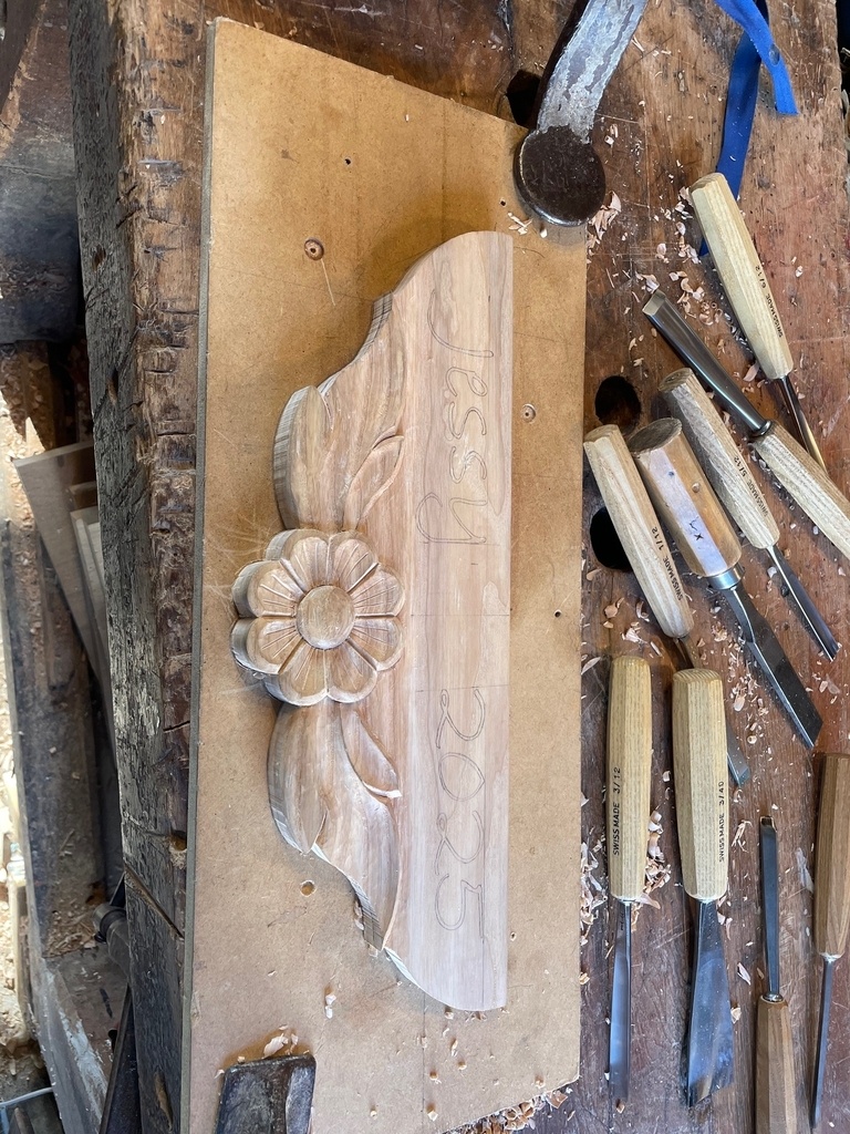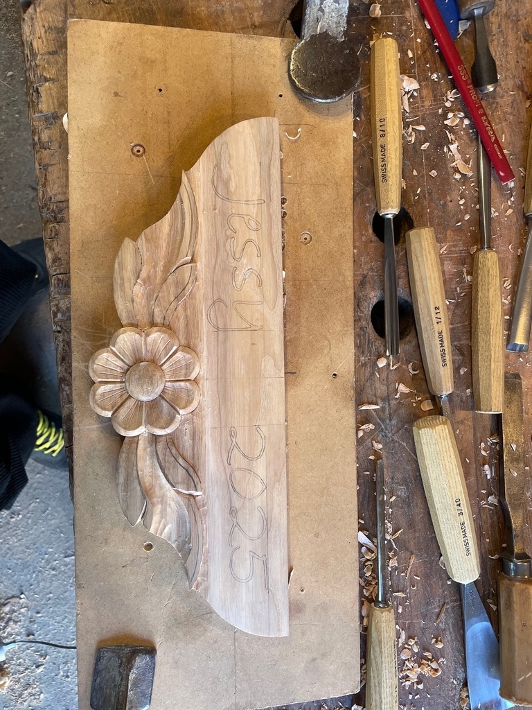 Le motif de la fleur et des feuilles est tiré de l'excellent ouvrage de Jean-Pol GOMERIEUX "Manuel de sculpture sur bois".