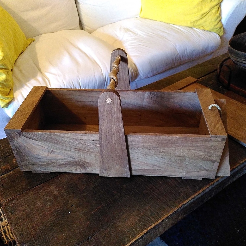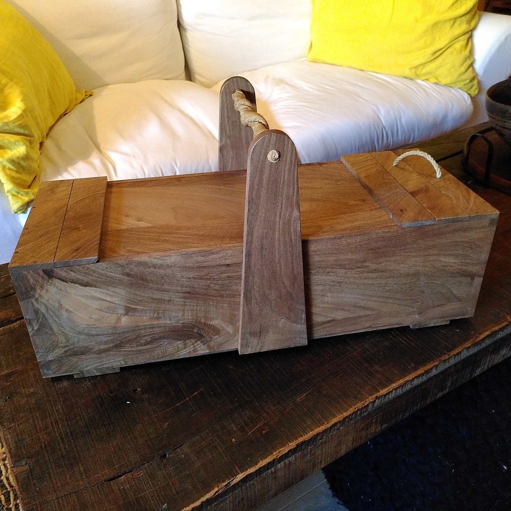 souvent, dans les caisses japonaises, on cloue une pièce sur la face extérieure des côtés, qui sert de poignée (exemple ici). Mais en regardant mieux,j'ai l'impression que tu as fait des queues d'arondes!
