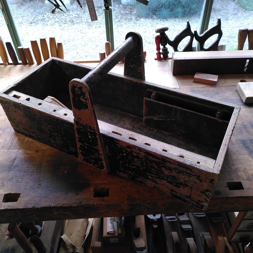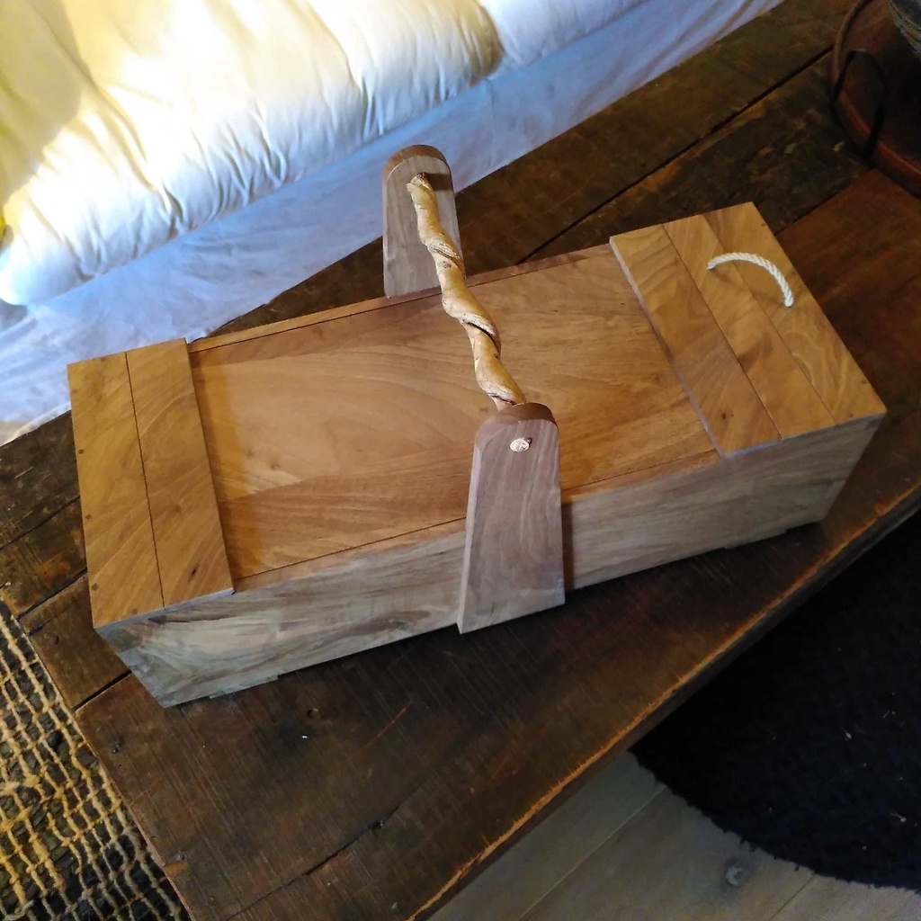 Je me suis basé sur ma caisse baladeuse d'ébéniste, avec un couvercle façon boite japonaise, très tendance actuellement... C'est du noyer, issu d'un arbre mort sur pied et que j'ai abattu et fait scier il n'y à pas très longtemps. La poignée vient de la forêt de Mervent, l'arbrisseau était étranglé par une liane en spirale, d'où l'aspect inhabituel.