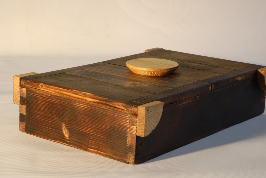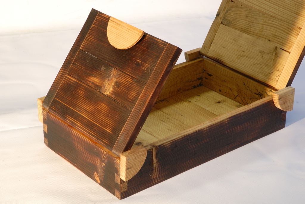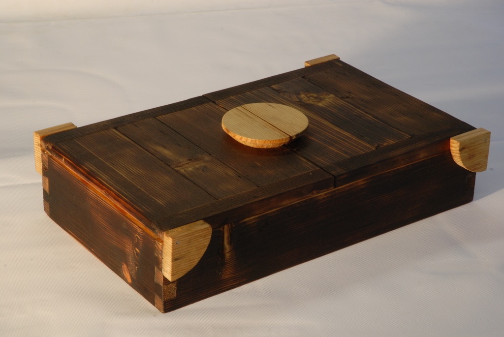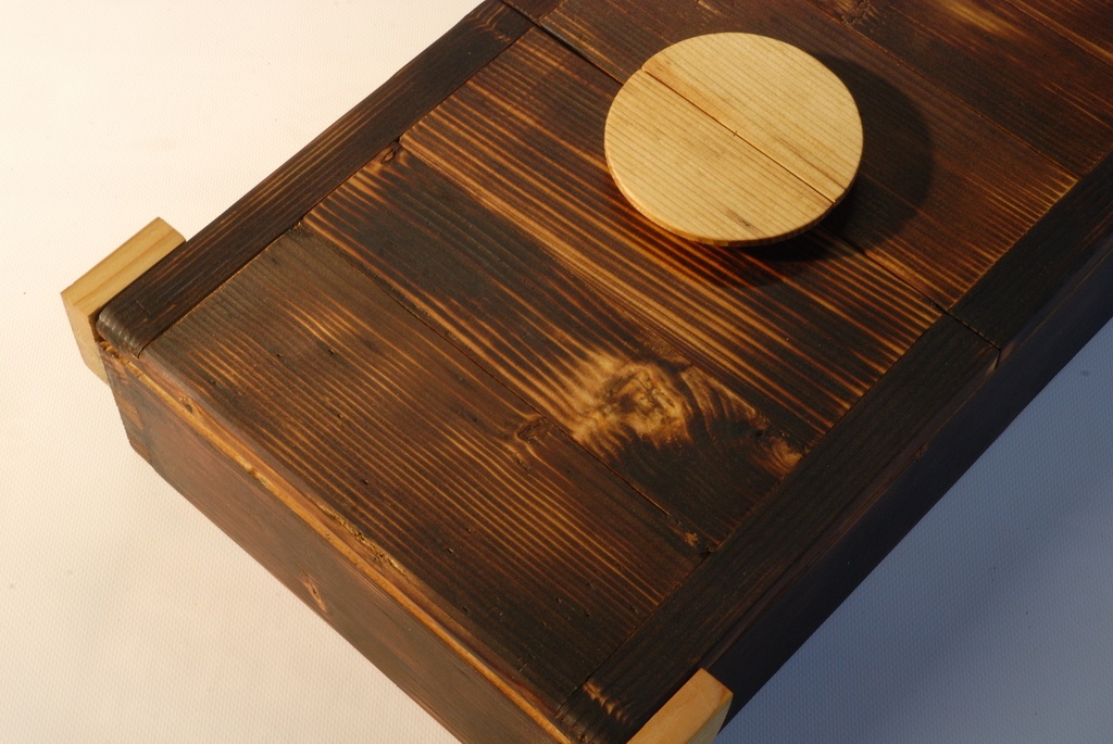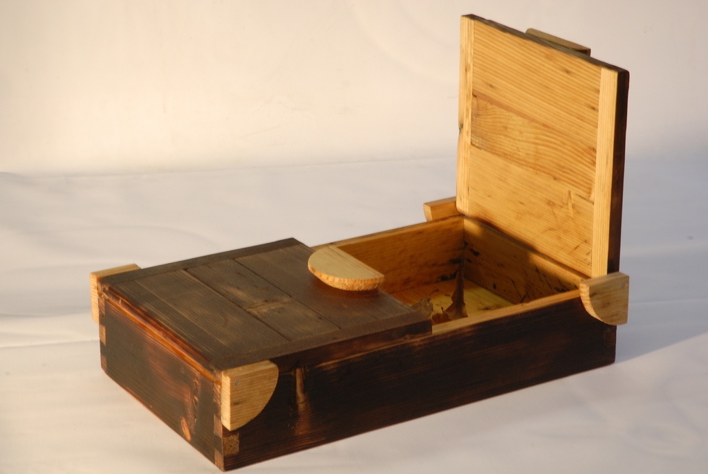 Bon mais avec un couvercle ce serait mieux, hop c'est fait, en 2 parties c'est joli, brulage. Je regarde depuis longtemps les charnières en bois mais ce bois ne me semble pas adapté, alors je cogite (exclus les charnières métalliques pour ce loisir) et avec des bouts de bois restant j'imagine ces pièces arrondies pour apporter une touche d'originalité, coins et poignées du couvercle, collés. Je coupe des petites longueurs de clou diamètre 3,7mm, les coins sont percés avec un trou de 3,5mm, agrandi à 4mm dans les volets du couvercle. Quelques passes de rabots, ajustage, ça fonctionne.