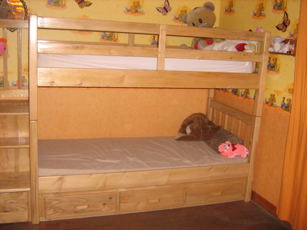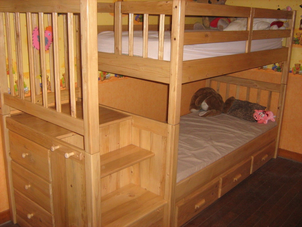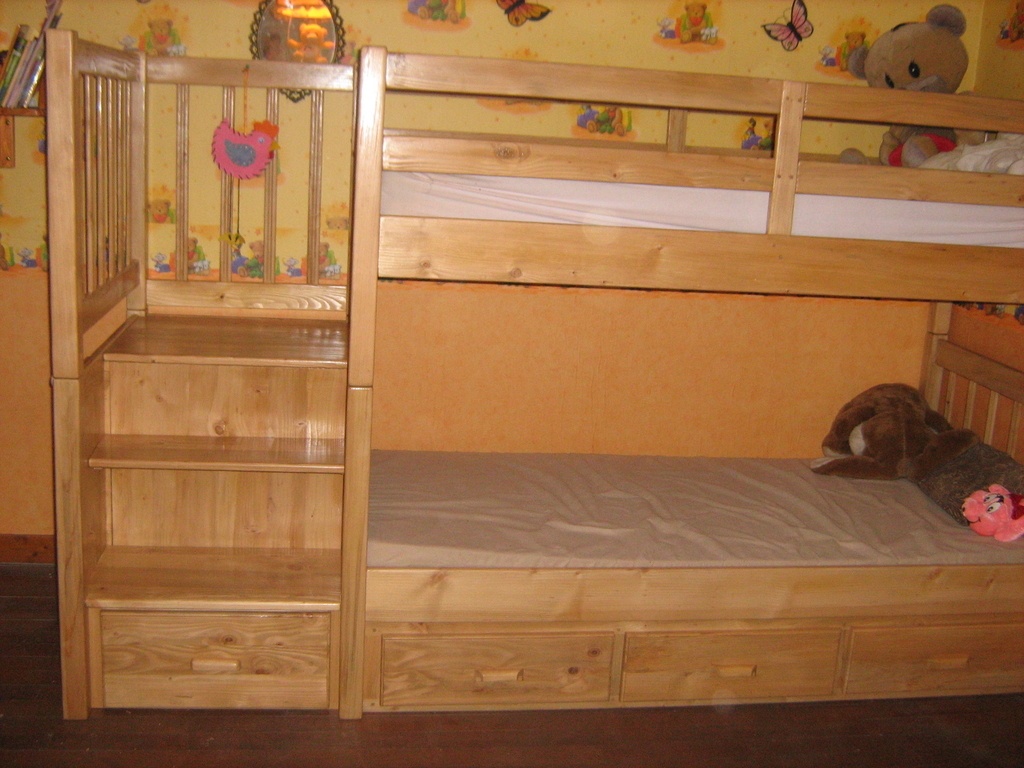Bien joli. Petite expérience perso: lorsque notre fille était petite, je lui avait fabriqué un lit au dessus d'un bureau et placard, un petite échelle pour monter dans le lit. L'échelle était vernis et la petite est montée en chaussettes, elle a glissé pour atterrir sur la tête, plus de peur que de mal heureusement. Un petit conseil donc: mettre un matériau anti-glissant sur les marches.