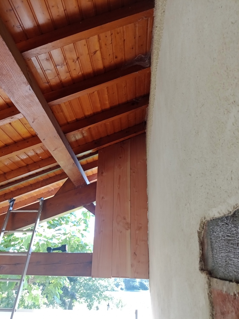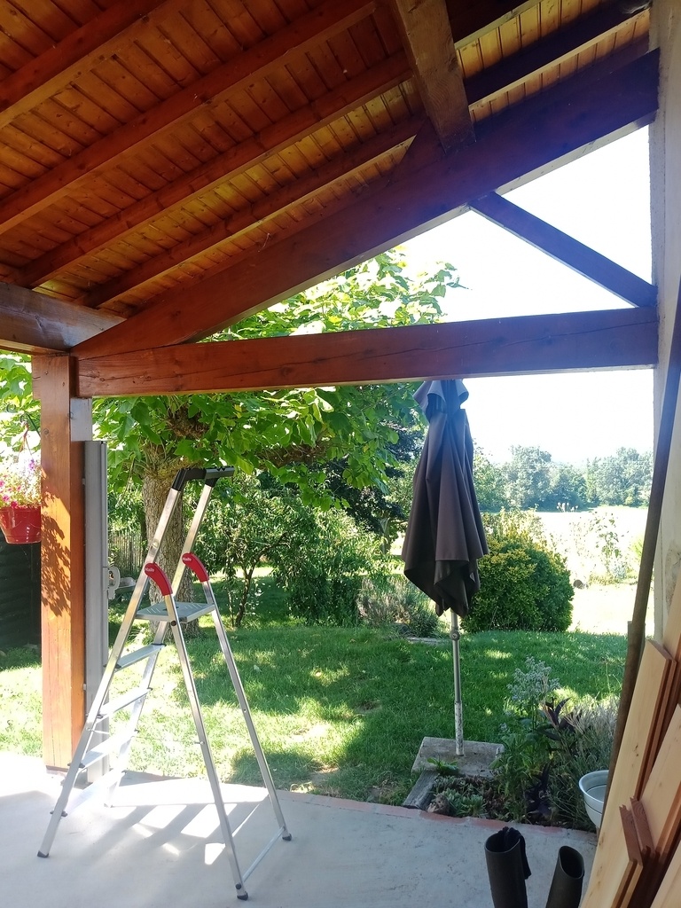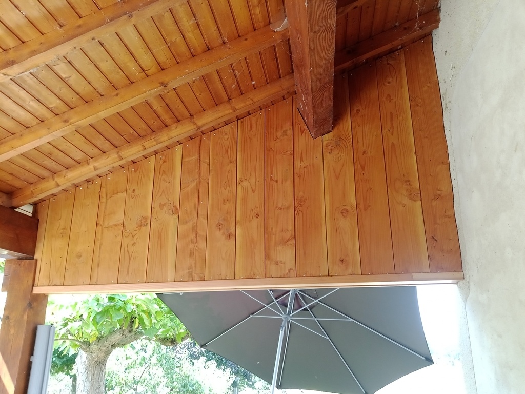 Afin d'empêcher les feuilles et les rayons du soleil de passer par la demi-ferme de ma terrasse, j'ai voulu faire une bardage de chaque côté. Celui-ci est en douglas. Il est raboté, bouveté, et lasuré en deux couches.