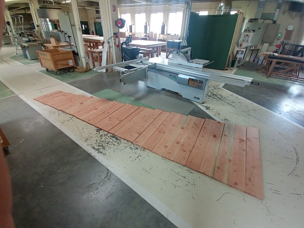 Les planches sont fixées sur des tasseaux en bois rouge et ont à leur extrémité une cornière en douglas.