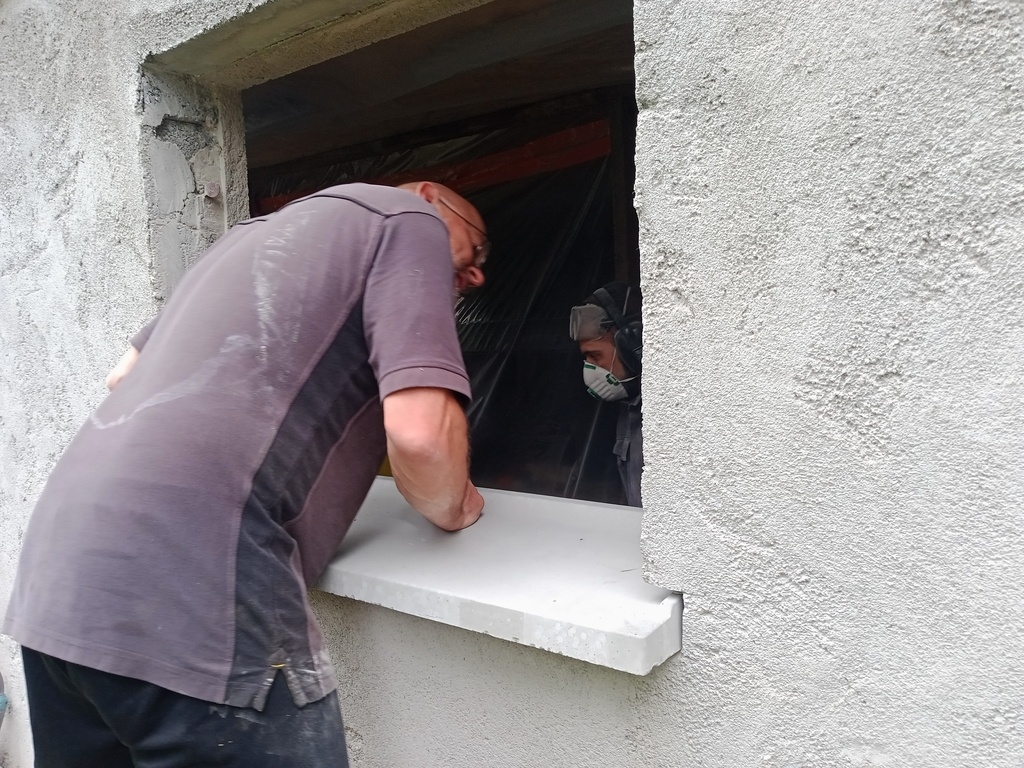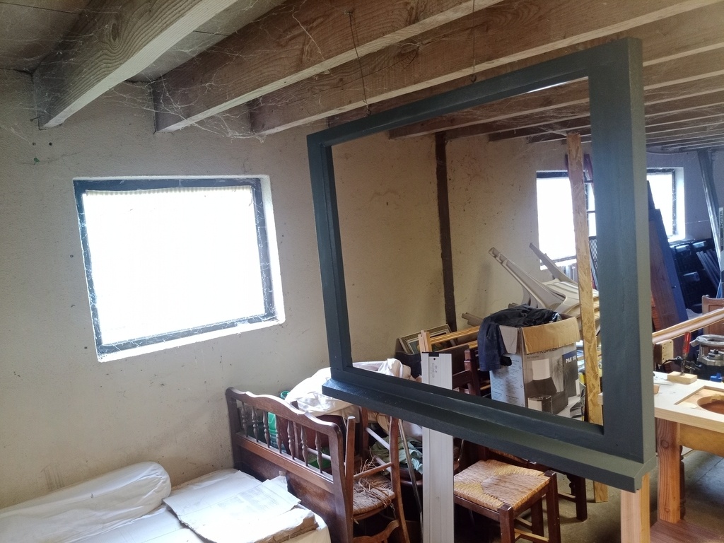 Plusieurs couches de laque polyuréthane microporeuse gris anthracite sont appliquées, la vitre double vitrage est commandée et la fenêtre est posée. Les parcloses sont pointées et un joins silicone gris anthracite est appliqué en intérieur et en extérieur.
