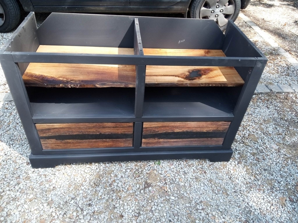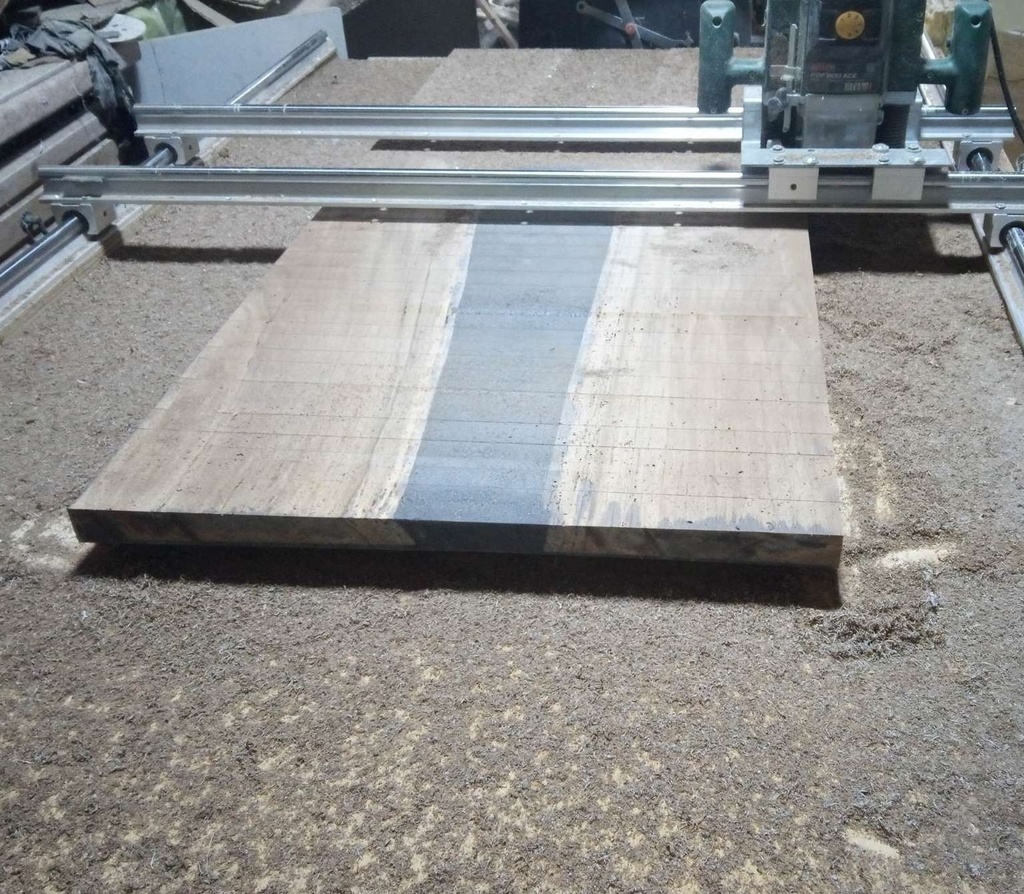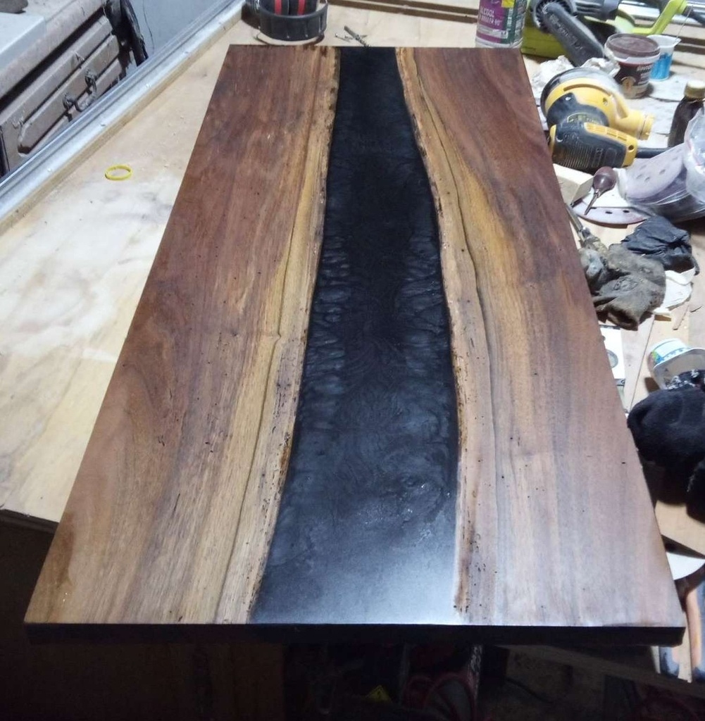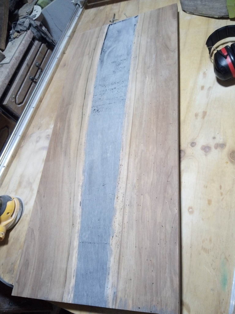 je démonte le plateau , mesure et commence donc à fabriquer un nouveau plateau en noyer échauffé et de l'epoxy noir.