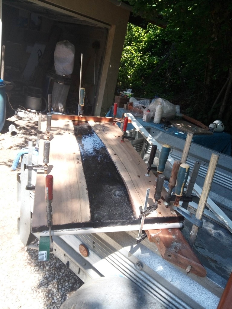 après coulage, surfaçage, et je le colle sur l'ancien plateau que j'ai redécouper avec un angle à 45°