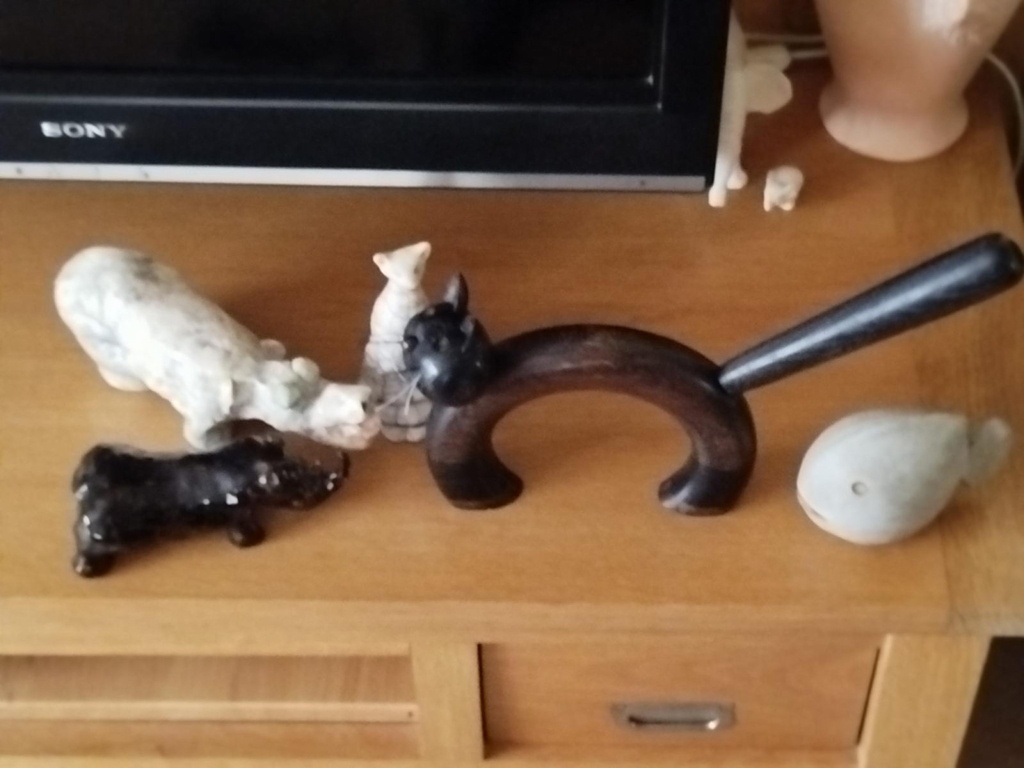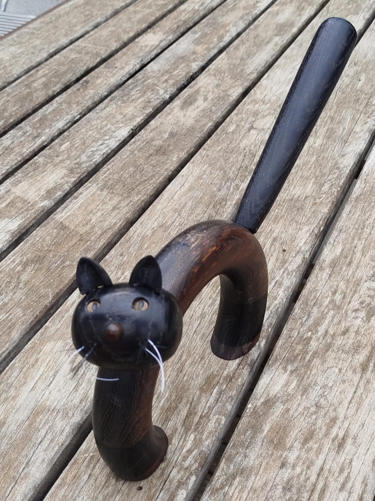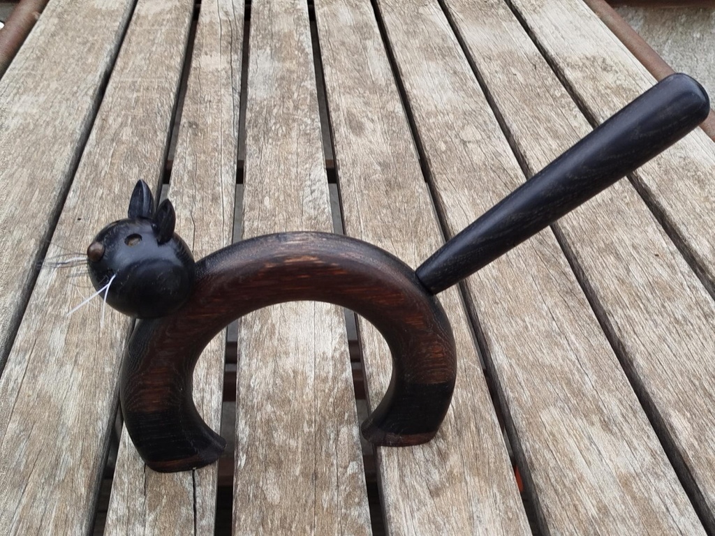 Chat en chêne tiré de bûches de bois de chauffage, sciées, corroyées, assemblées en plateau double épaisseur. Tournage en bois de travers pour en tirer un anneau (200 x 40).