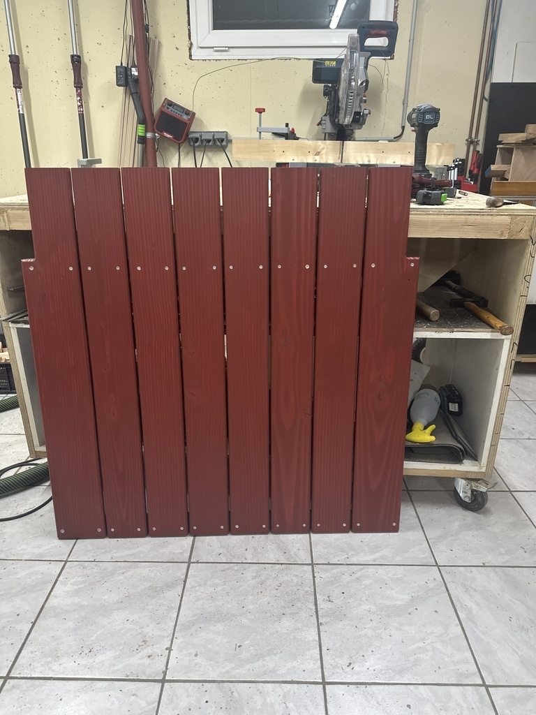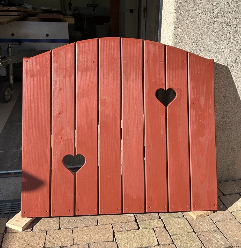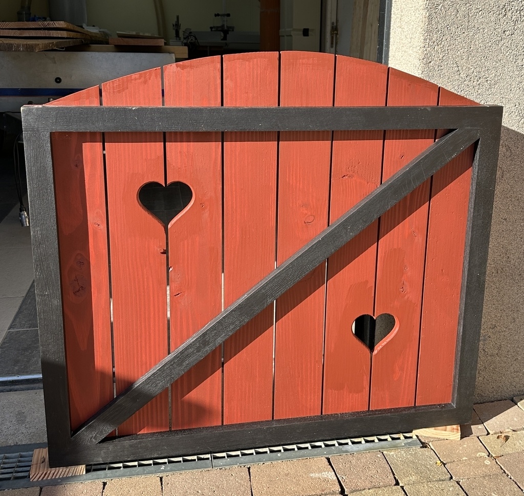 Réalisation d'un portillon, bardage en Douglas, cadre en chêne avec incrustation de coeur pour aller avec les volets que vous pouvez découvrir dans une autres réalisation.