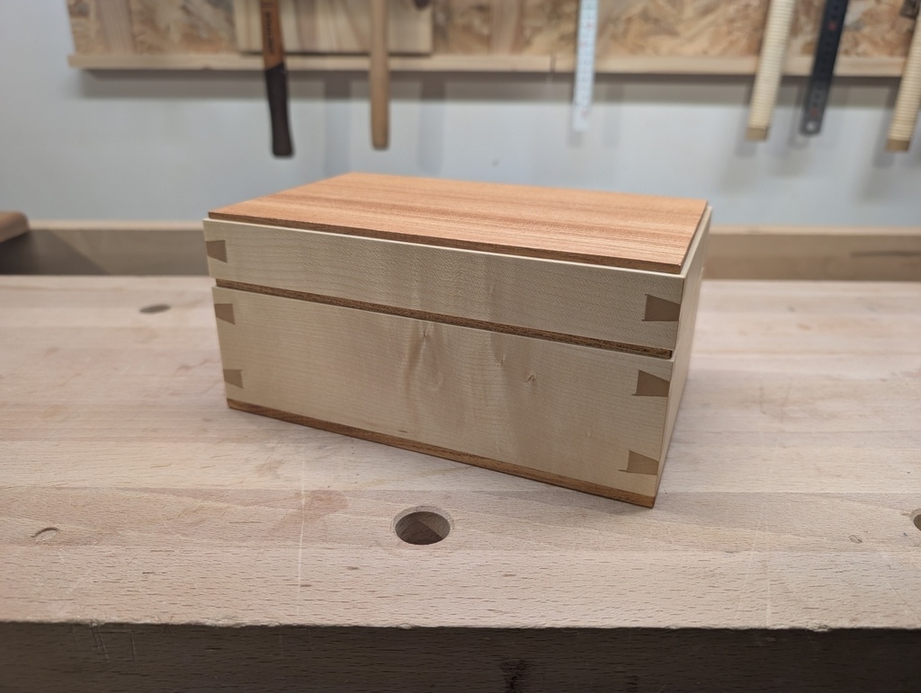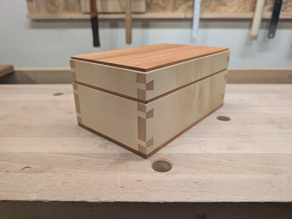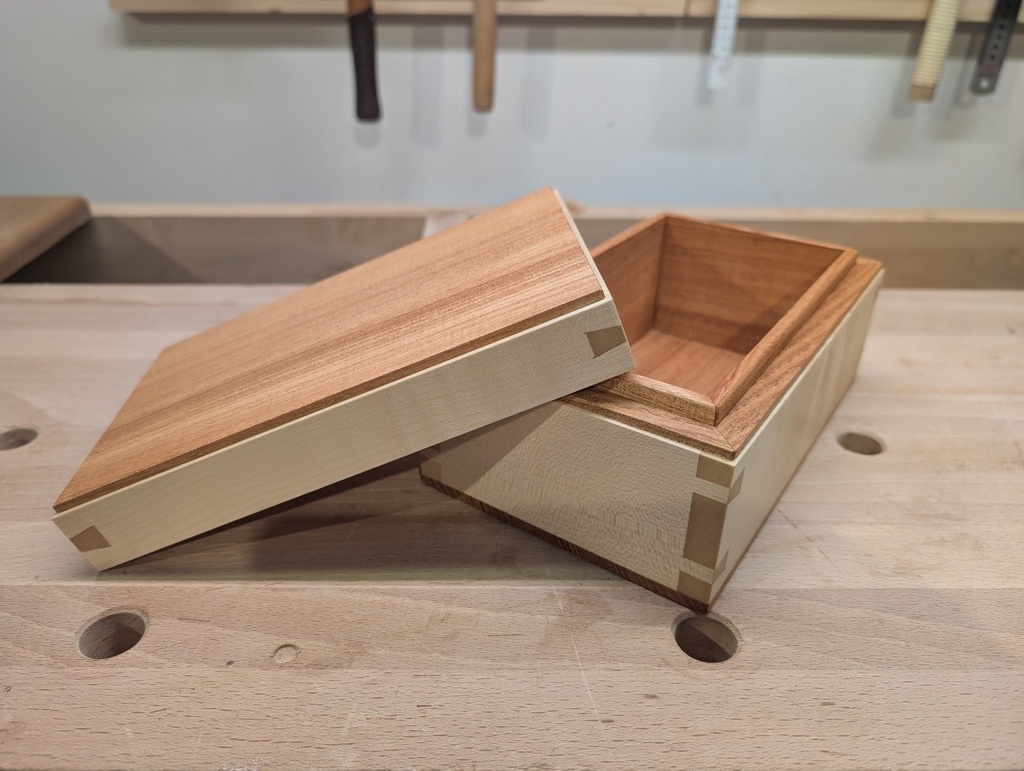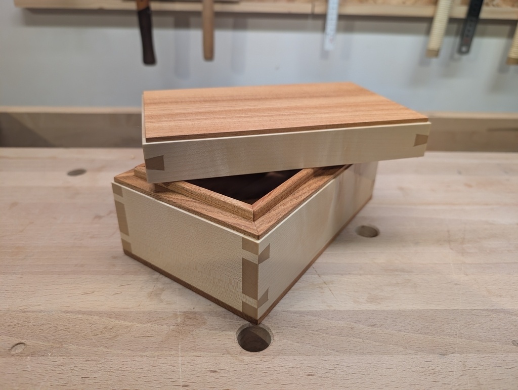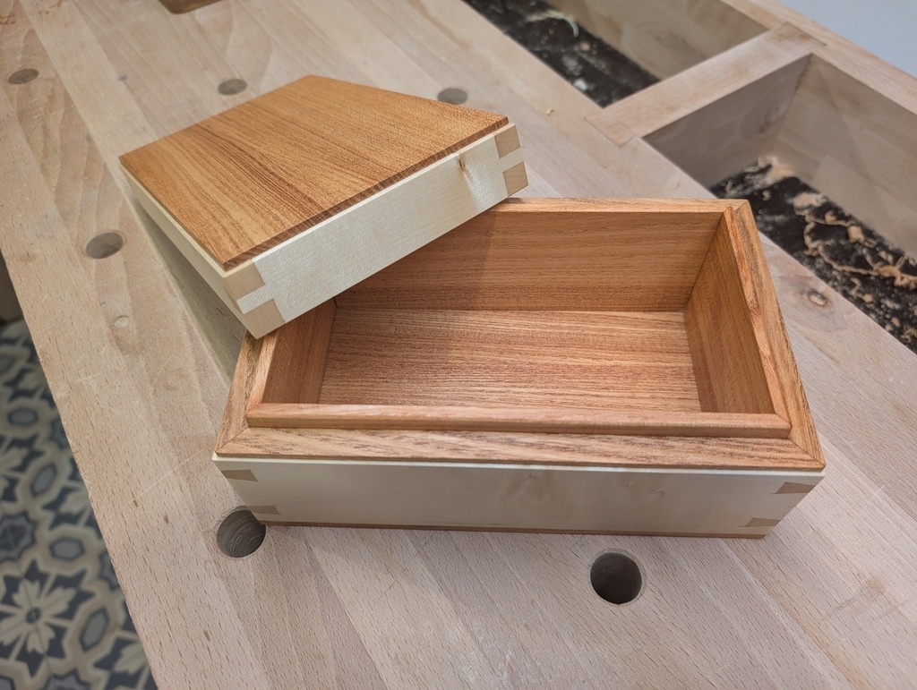 Voici une petite boite 200 x 130 x 90 mm en érable sycomore (bois blanc) et en je ne sais pas quoi (bois foncé - assez dense).
