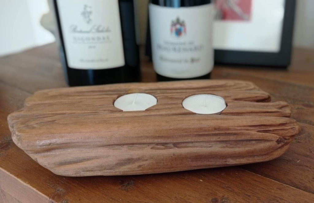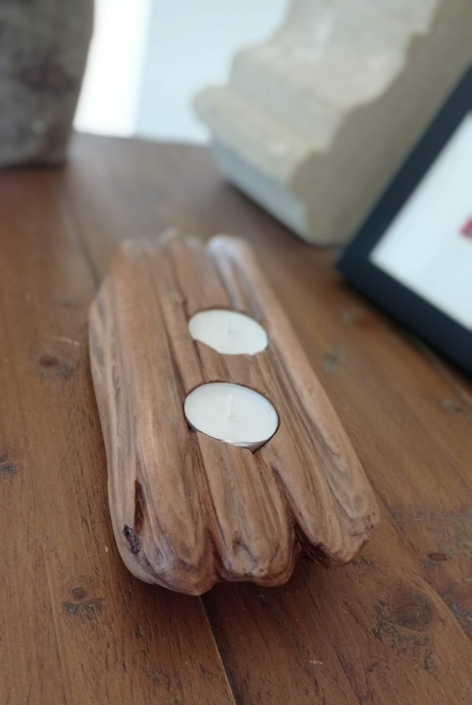 Bougeoir en bois flotté, la nature l'a façonné, deux trous, un petit coup de ponçage et de vernis.