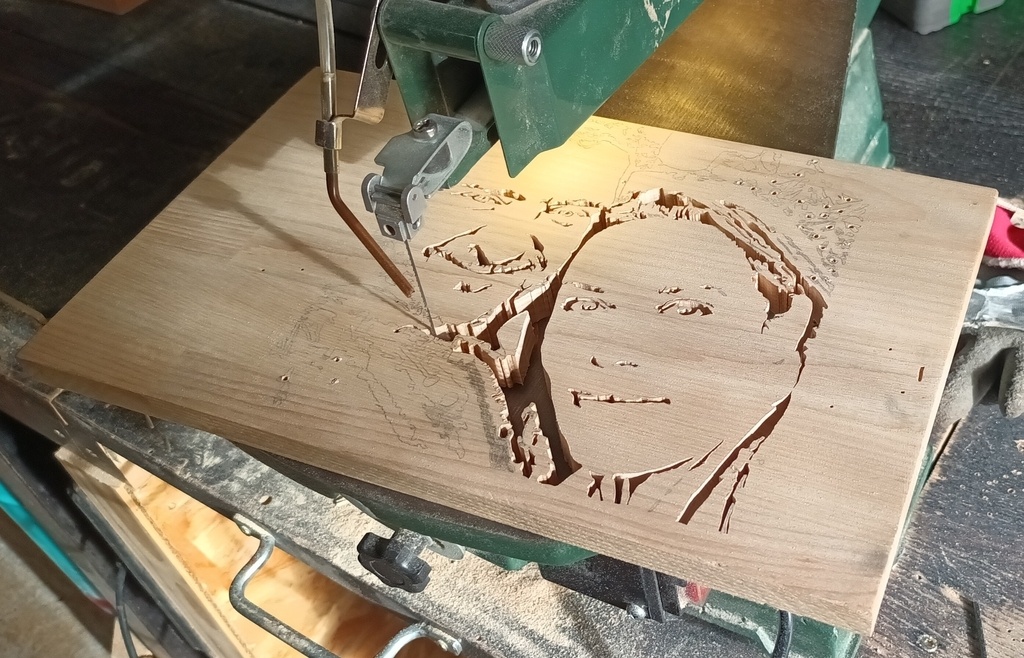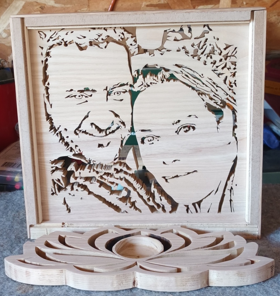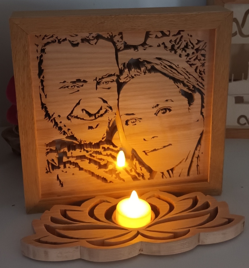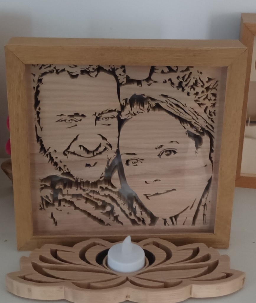 Tableau chantourné dans du hêtre épaisseur 15mm. Cadre réalisé dans des chutes de parquet, plaque de plexiglas pour protéger l'intérieur de la poussière et d'éventuels chocs. Réalisation d'un support également en hêtre représentant une fleur de lotus porte bougie.