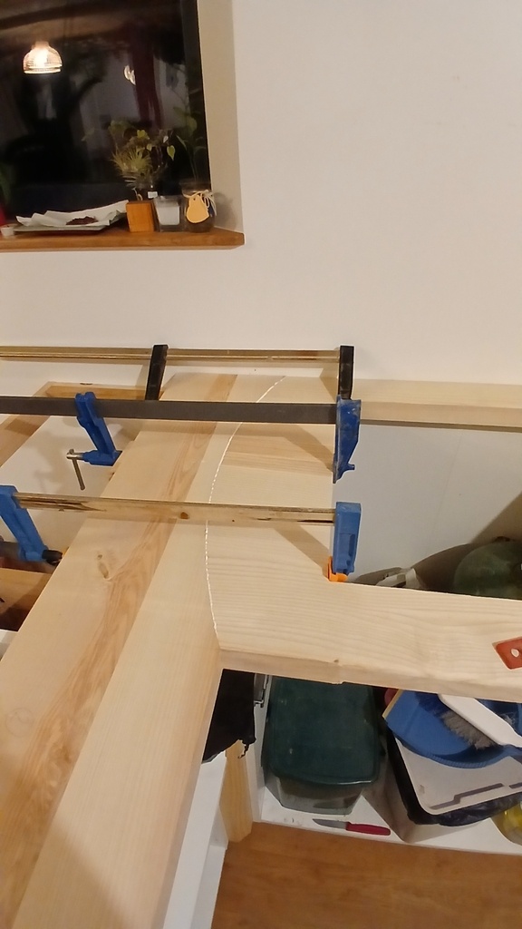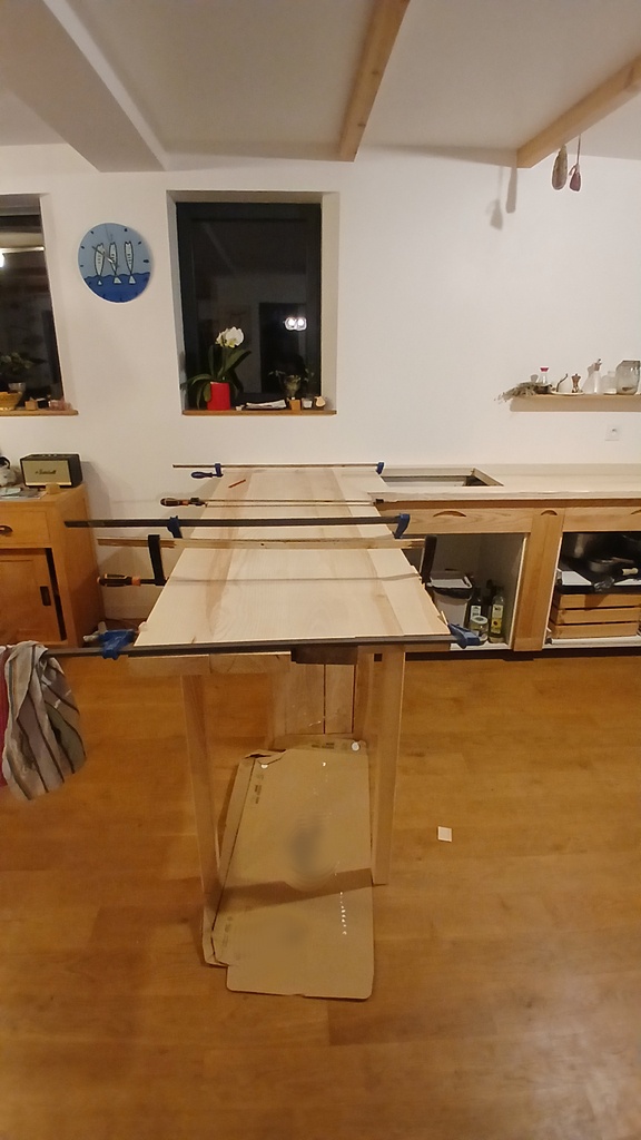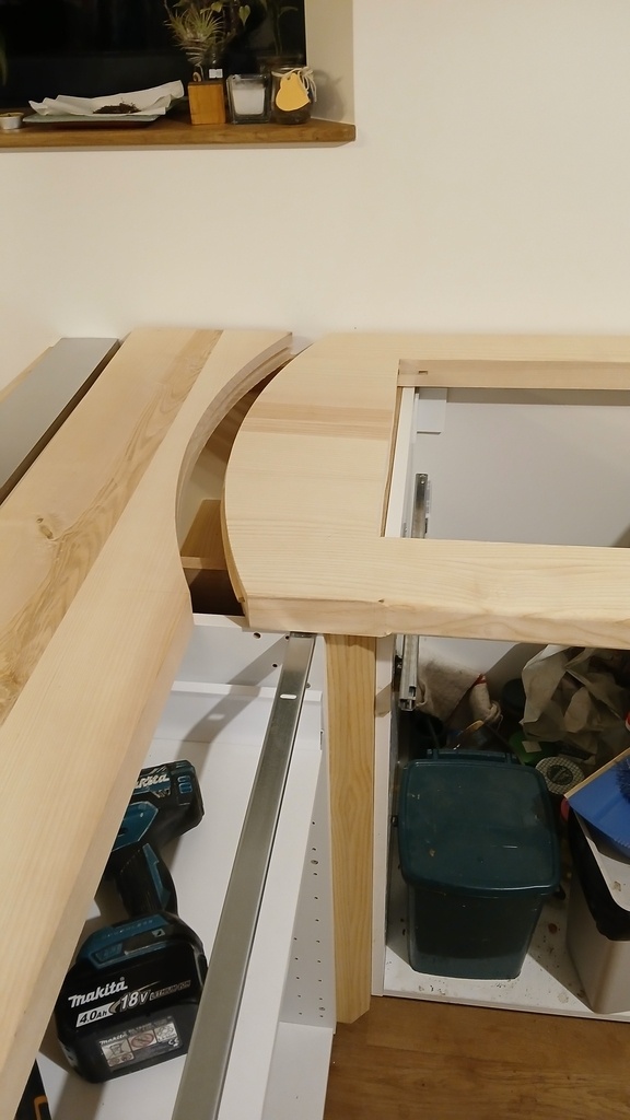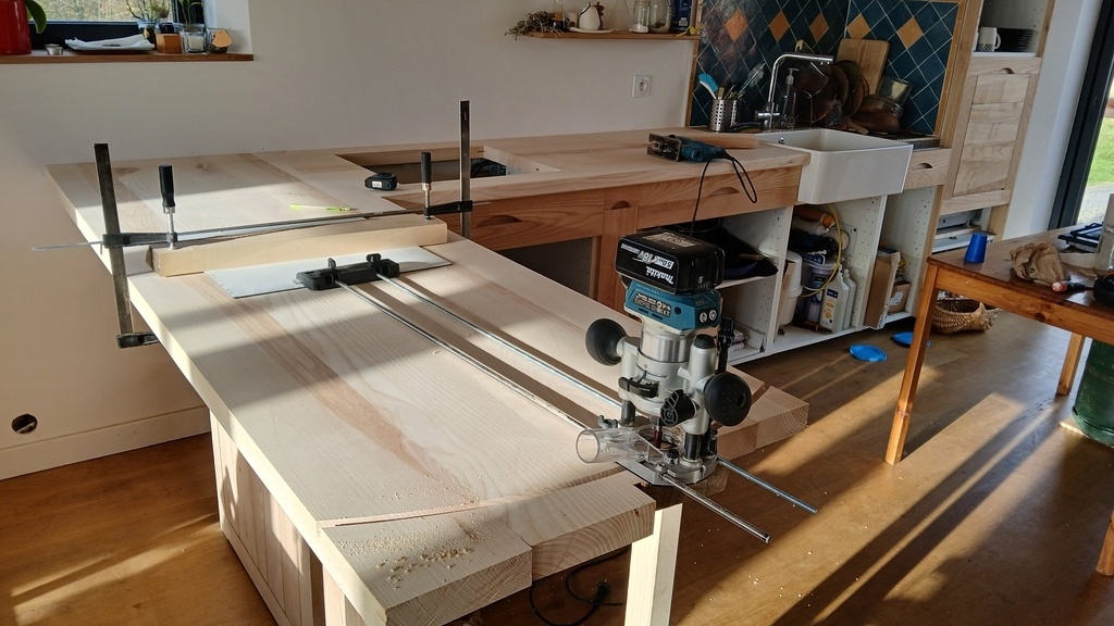 Plan de travail en frêne massif pour ma cuisine, d’environ 45mm d'épaisseur. Les deux parties du L sont assemblées en arc de cercle avec une languette rapportée. Compte tenu du poids l'assemblage a été fait en place. Finition à l'huile de tung diluée à l'huile d'orange (5 couches). Je suis très contenant de cette finition mais si c'était à refaire je passerai ou bouche pore avant l'application de l'huile.