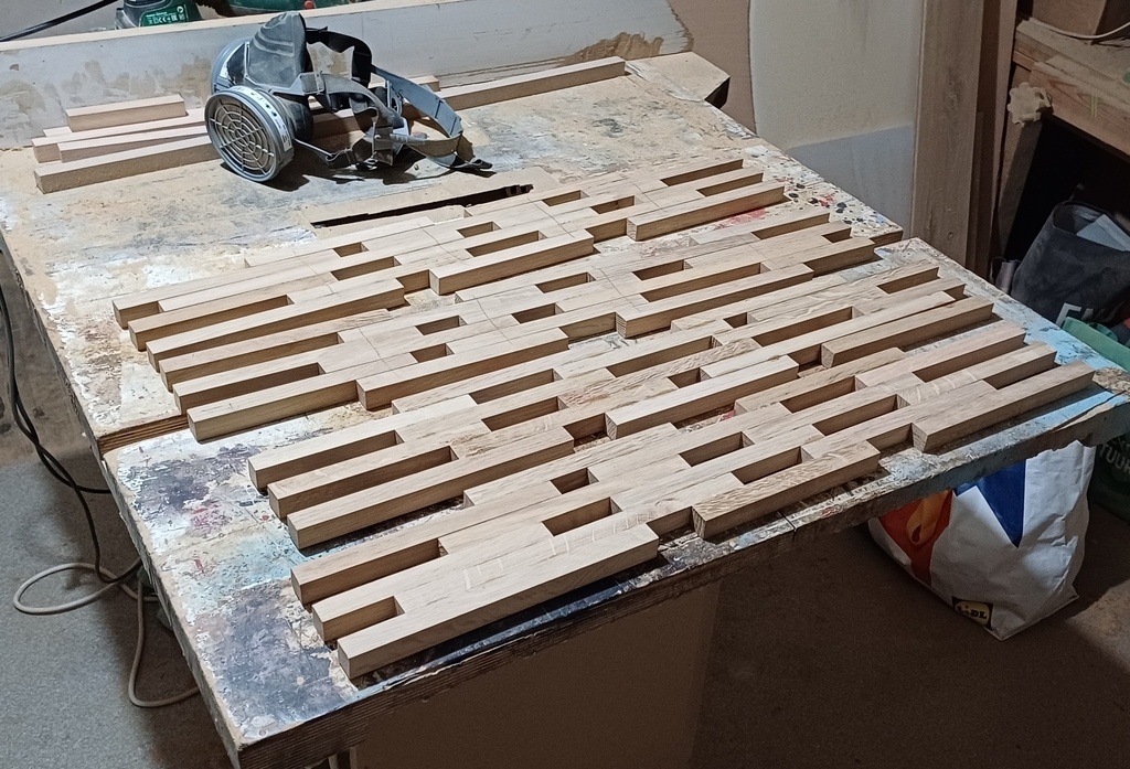 J'ai d'abord fait quatre tas avec les chutes puis je les ai positionnés au hasard pour que l'assemblage tienne sur lui-même ainsi que sur la paroi suivante.
